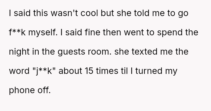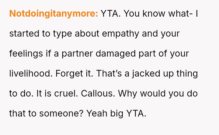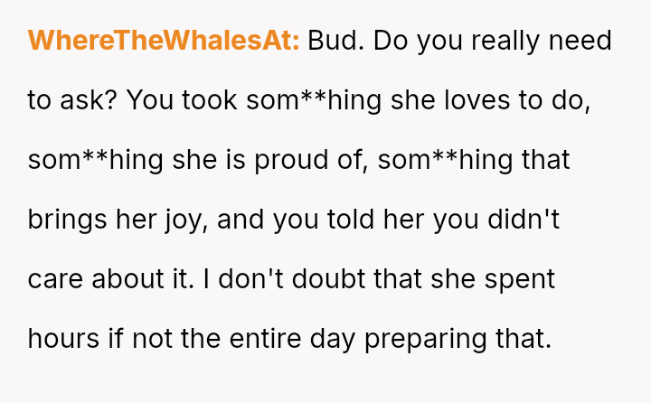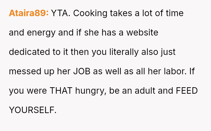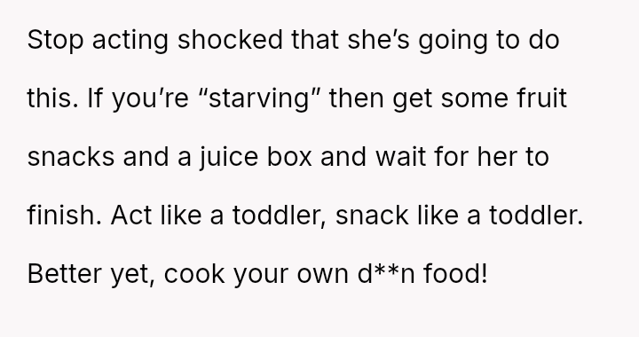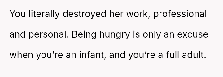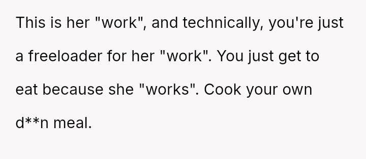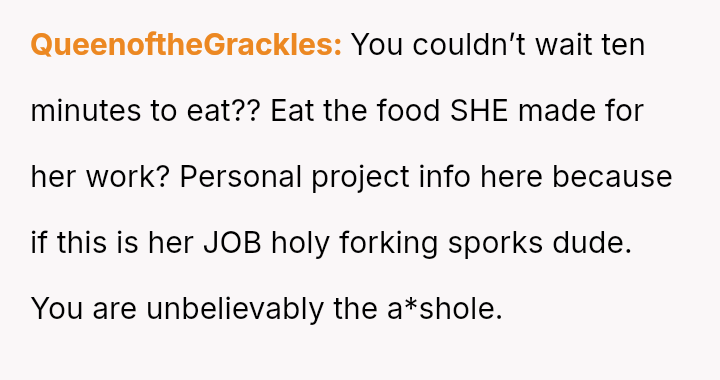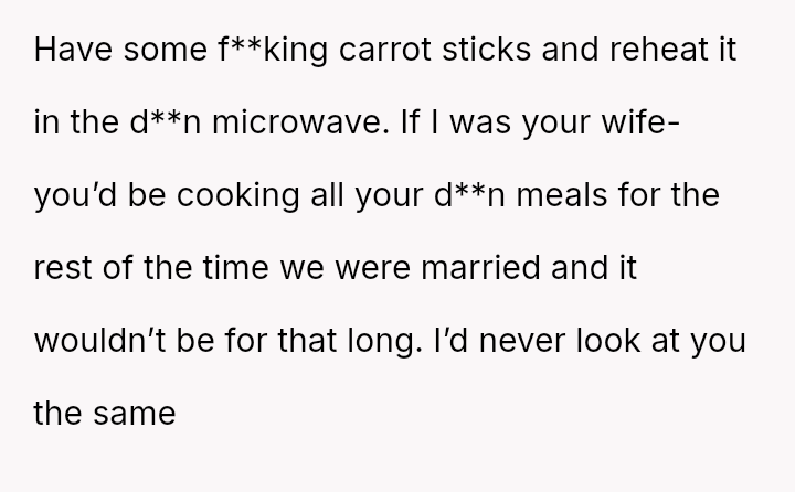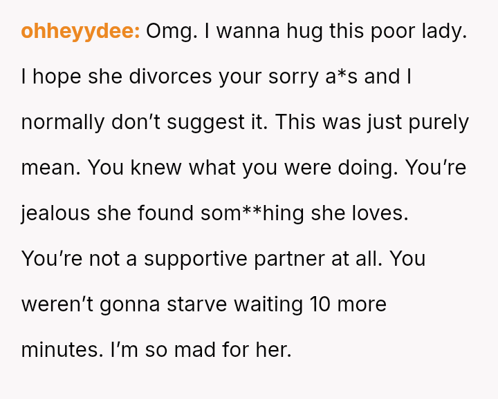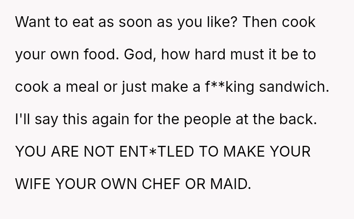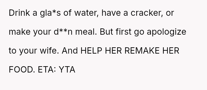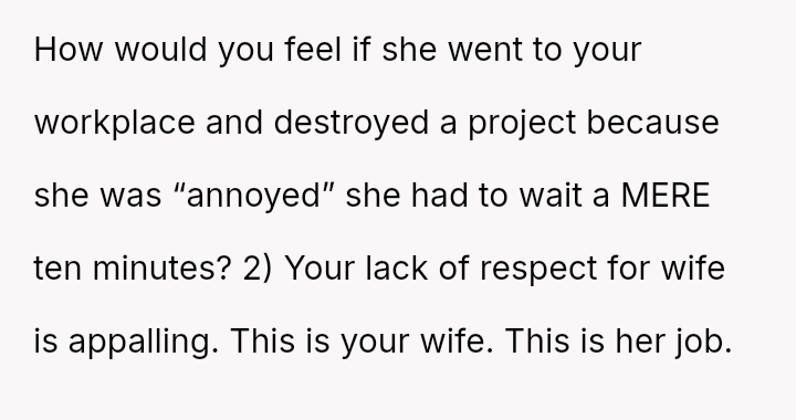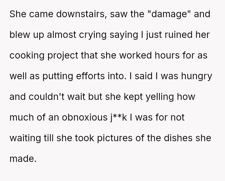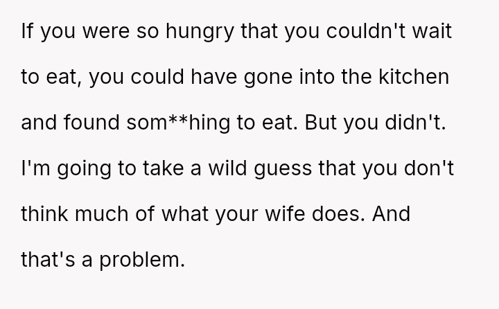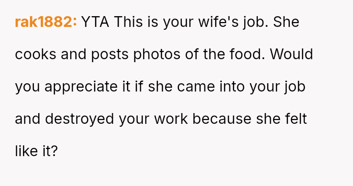 Was the husband justified in prioritizing his immediate hunger and es**blished routine over his wife's documented professional/hobby commitment, or did his act of disruption cross a line into deliberate sabotage, warranting the severity of the wife's reaction and subsequent threat?