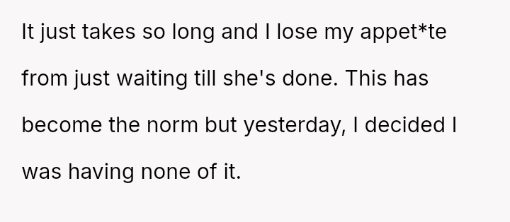 What was once a simple meal had become a staged performance, and he found himself caught between admiration for her dedication and a restless need to simply eat. But yesterday, the simmering tension boiled over.