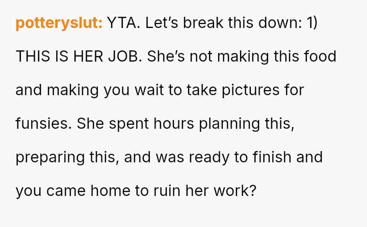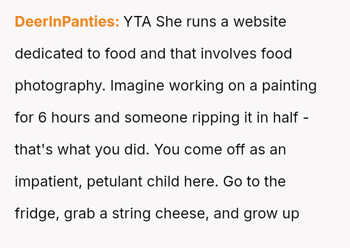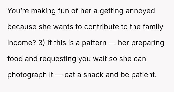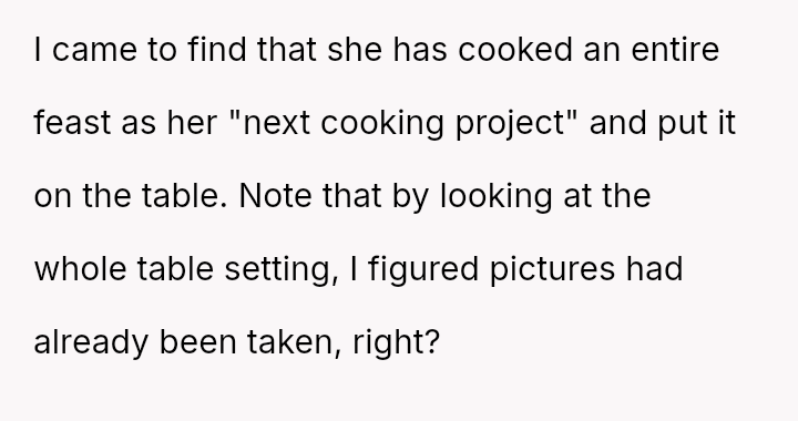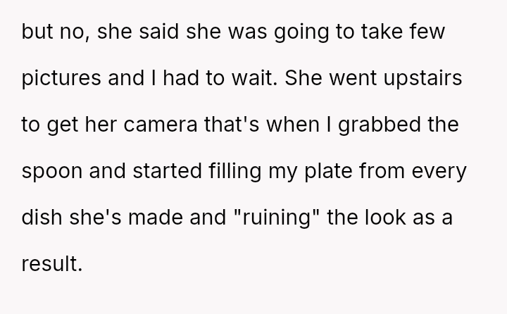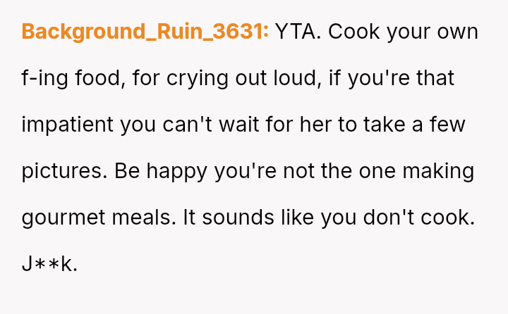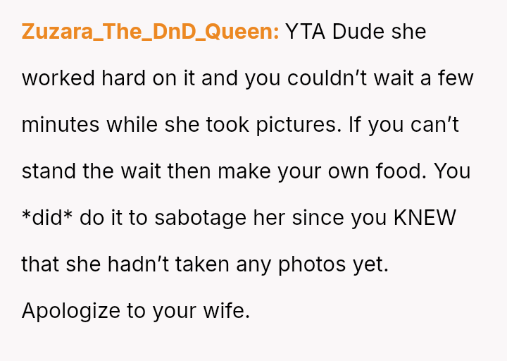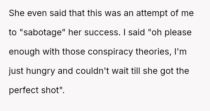 The core conflict involves a husband who reached his breaking point due to the delay in eating meals caused by his wife's need to photograph her food for her website and Instagram.
