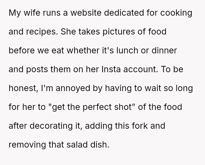 His wife’s pa*sion for capturing the perfect food photograph clashed with his growing hunger, each moment spent waiting stretching his appet*te thin and his patience thinner.