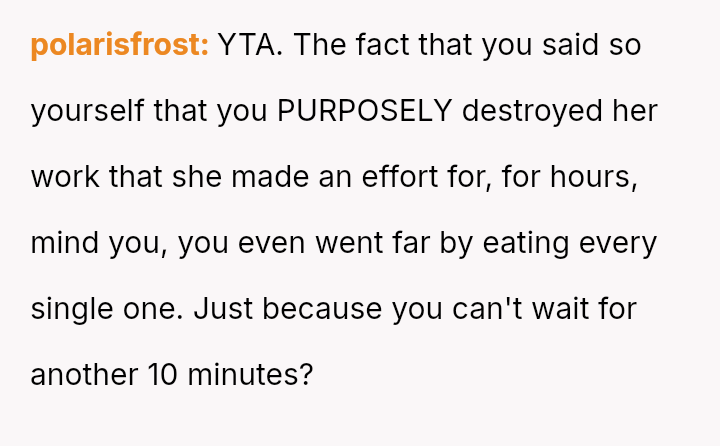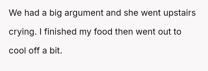 His impulsive action of eating the food before photography was completed led to an intense emotional outburst from his wife, who felt her significant effort and hours of work were deliberately sabotaged, resulting in a major fight and subsequent emotional withdrawal.