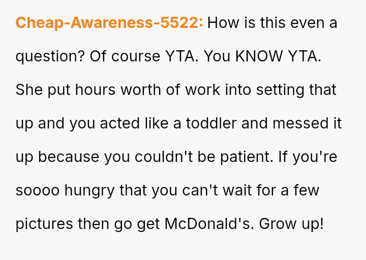 Faced with an elaborate feast meant for the lens, not the stomach, he made a bold, impulsive choice—seizing his plate and spoiling the picture-perfect scene.