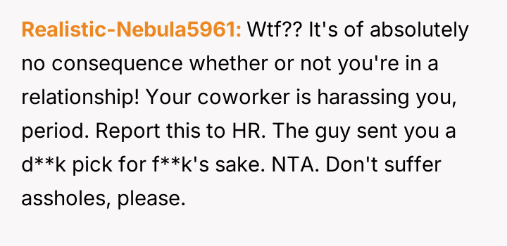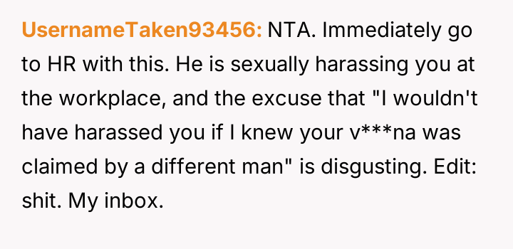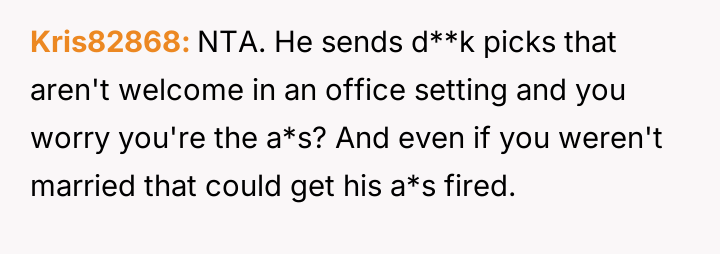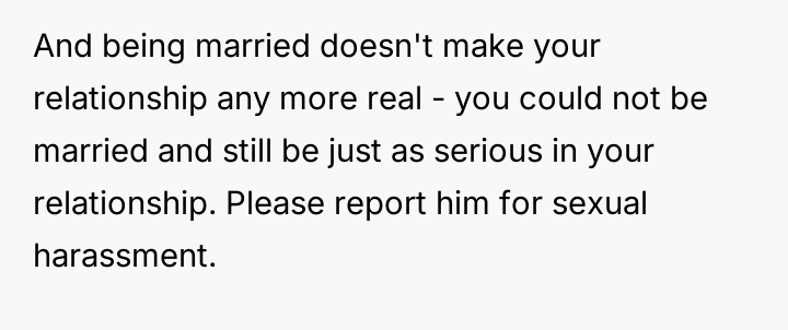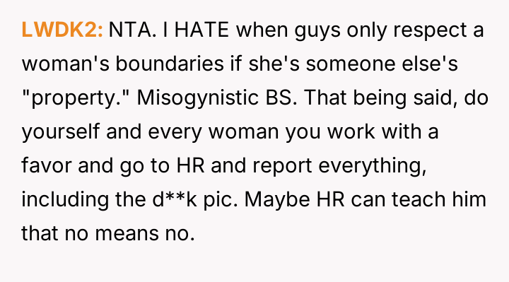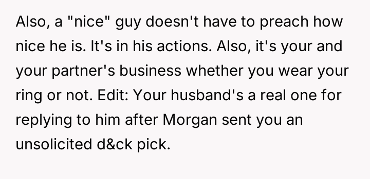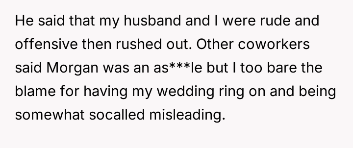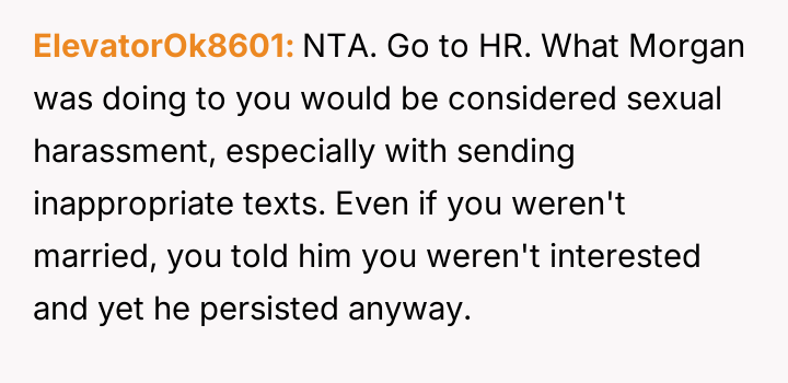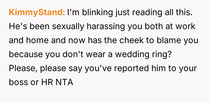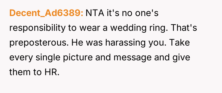The original poster (OP) is facing a difficult situation where her personal decision regarding jewelry (not wearing a wedding ring due to a skin condition) was exploited by a coworker, Morgan, to justify his persistent and sexually harassing behavior, which included sending explicit images.