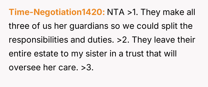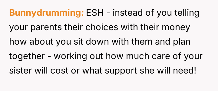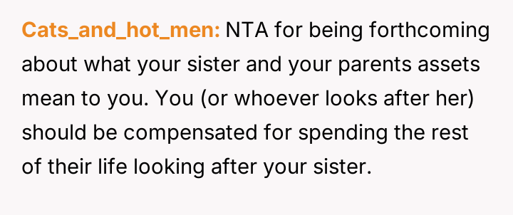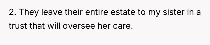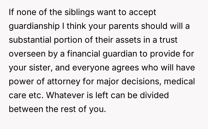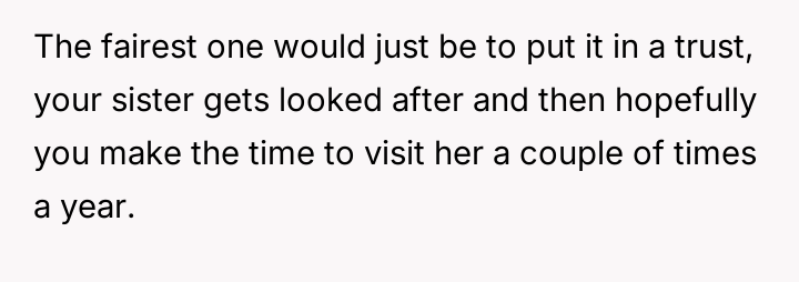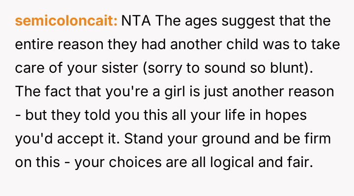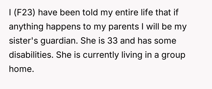 The original poster (OP) is facing a lifelong expectation from her parents to become the sole guardian for her disabled sister, a responsibility she feels ill-equipped or unwilling to shoulder due to her personal goals of travel and remote work.