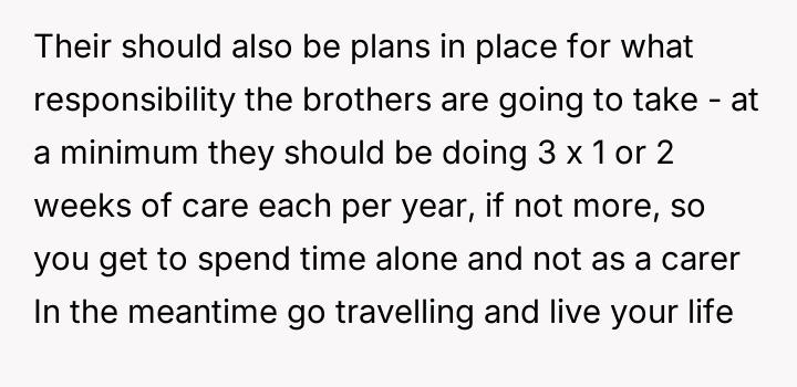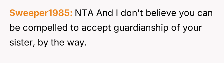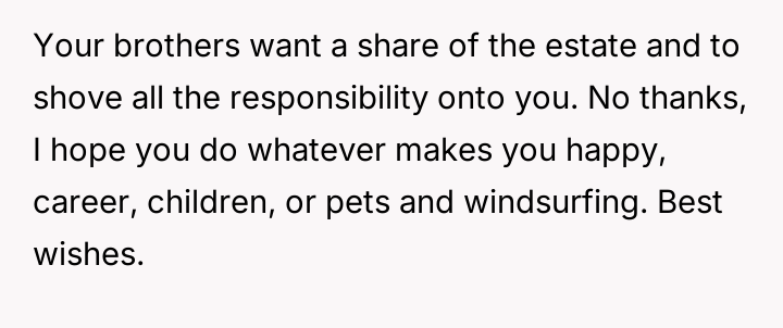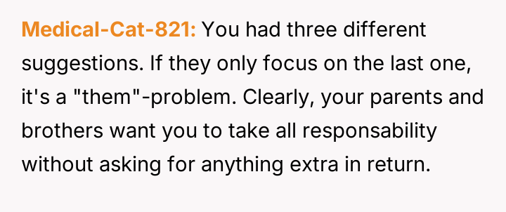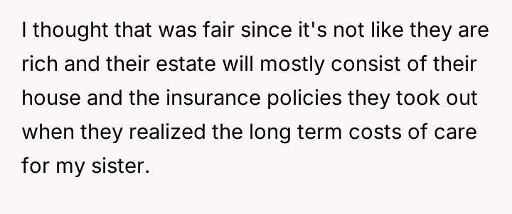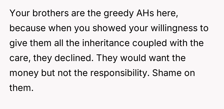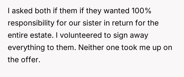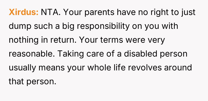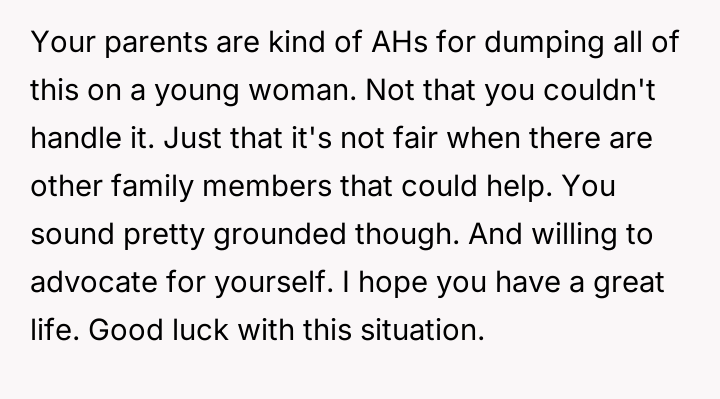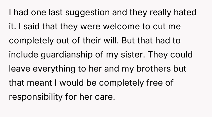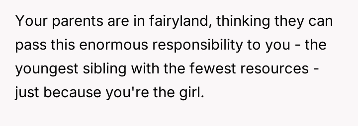 Given the OP's strong desire for independence versus her parents' entrenched expectations of familial duty, the core question remains: Is it reasonable for the OP to demand a formal exchange—financial assets for total guardianship responsibility—or does the moral obligation of kinship outweigh personal life plans, even if other siblings refuse equal responsibility?