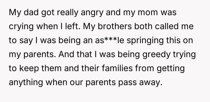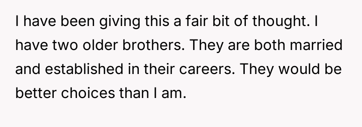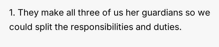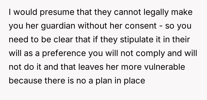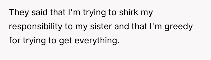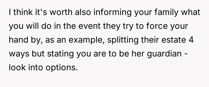 Her attempts to negotiate a shared guardianship or a financial trade-off for sole guardianship were met with anger and accusations of greed by her parents and siblings, leading to significant family conflict.
