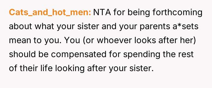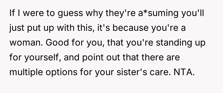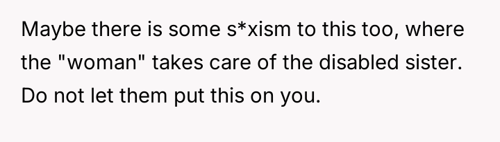 The original poster (OP) is facing a lifelong expectation from her parents to become the sole guardian for her disabled sister, a responsibility she feels ill-equipped or unwilling to shoulder due to her personal goals of travel and remote work.