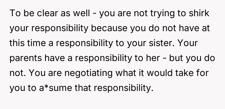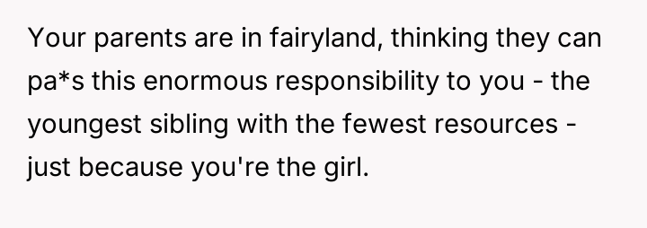Given the OP's strong desire for independence versus her parents' entrenched expectations of familial duty, the core question remains: Is it reasonable for the OP to demand a formal exchange—financial assets for total guardianship responsibility—or does the moral obligation of kinship outweigh personal life plans, even if other siblings refuse equal responsibility?