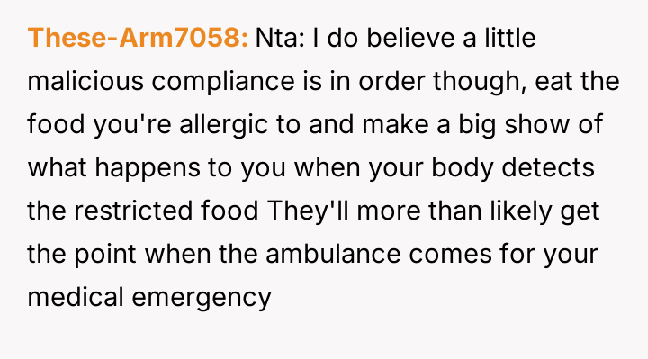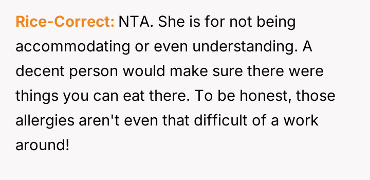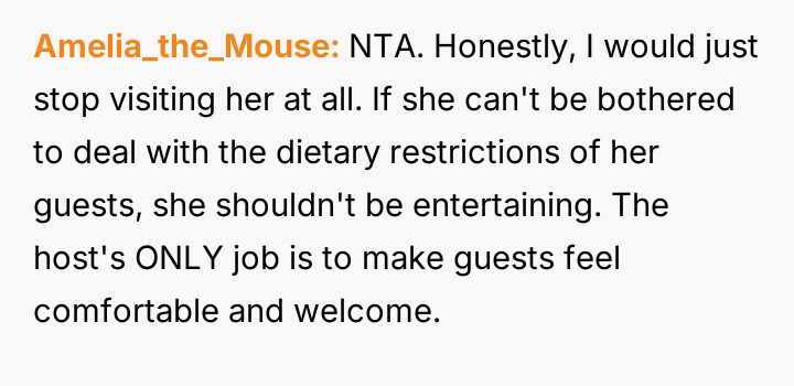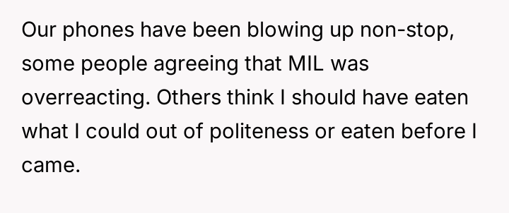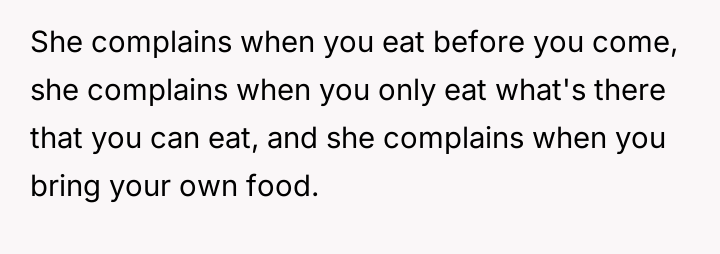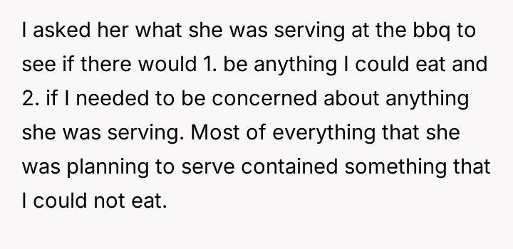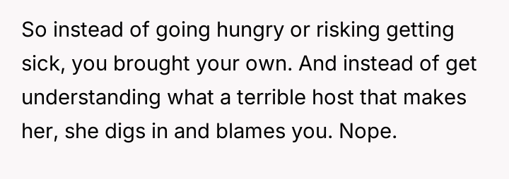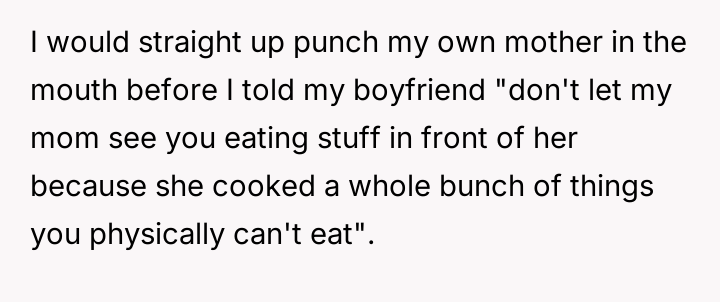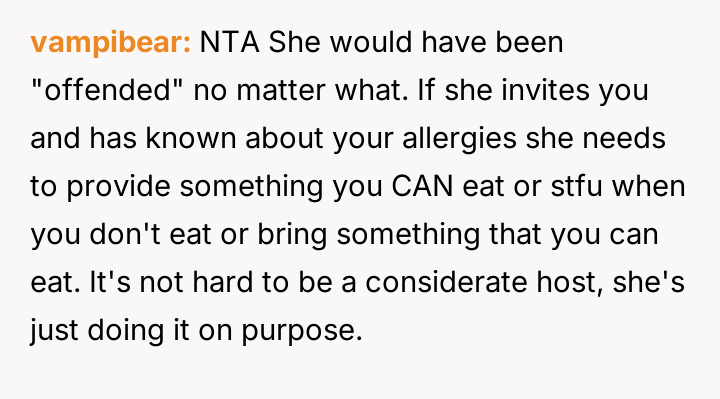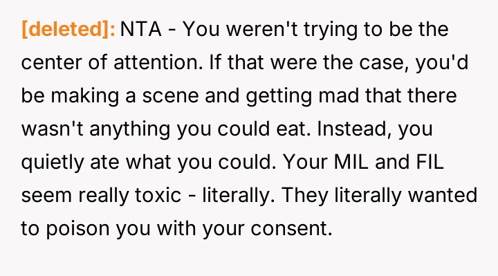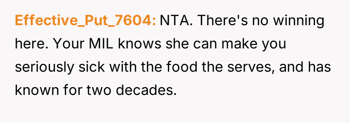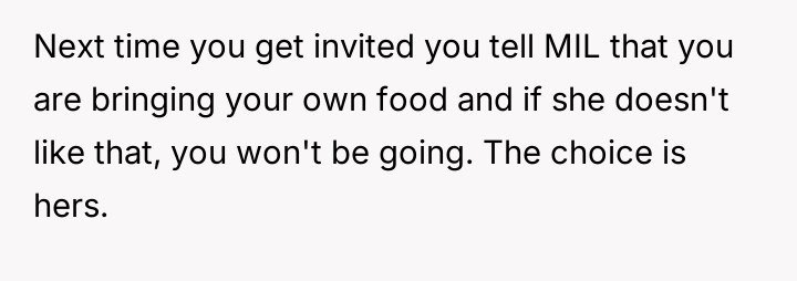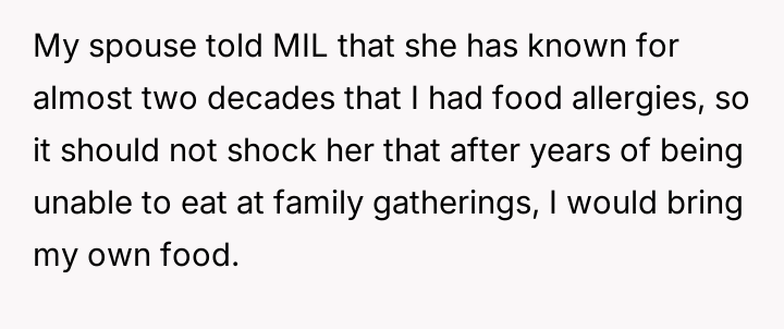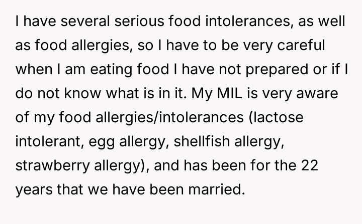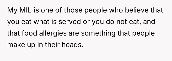 The original poster (OP) faced a recurring conflict where their serious, known food allergies clashed with the mother-in-law's (MIL) rigid expectation that guests must eat whatever is served, regardless of dietary restrictions.