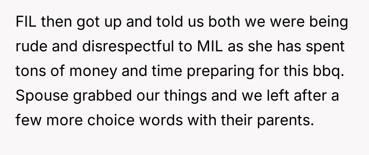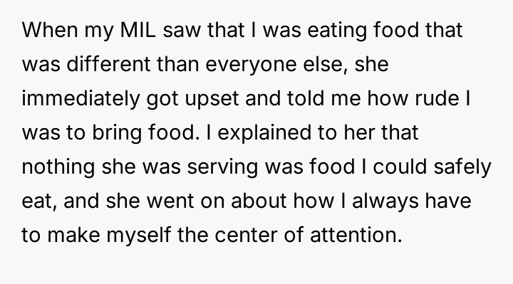 The OP attempted a discreet solution by bringing their own safe food, which resulted in a highly charged confrontation where the MIL and father-in-law (FIL) accused the OP of rudeness and seeking attention, leading to the OP and spouse leaving the event early.