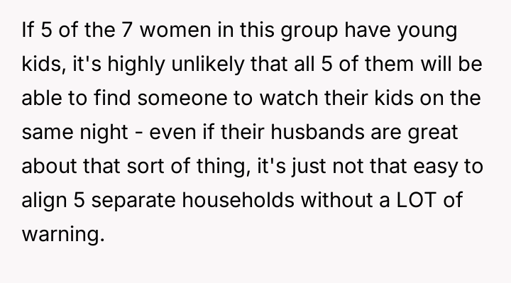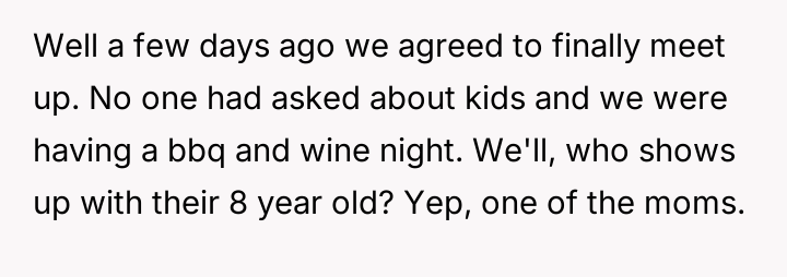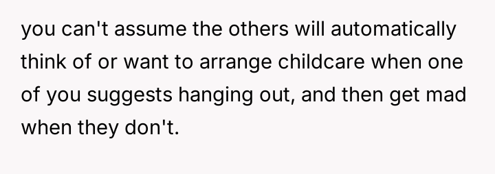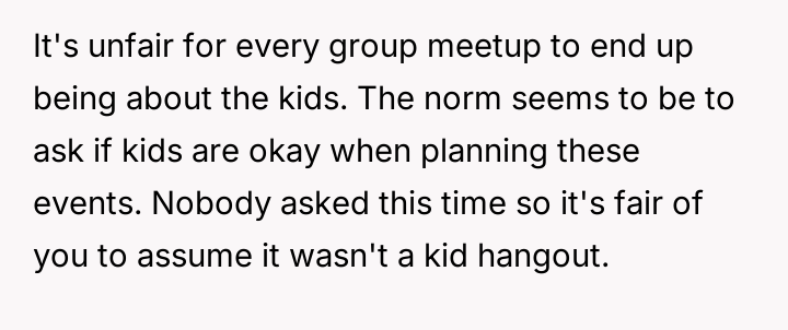 The original poster (OP) is facing a recurring conflict where social gatherings intended for adult friendship quickly become dominated by childcare responsibilities due to friends bringing their children.