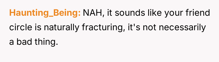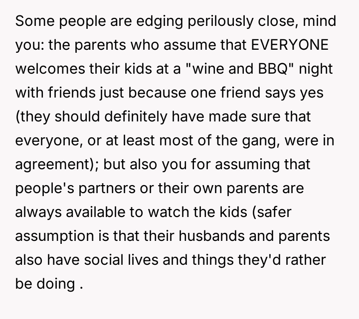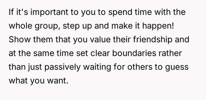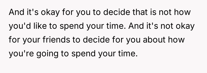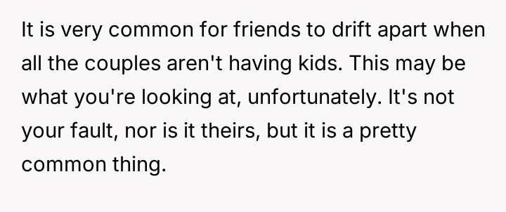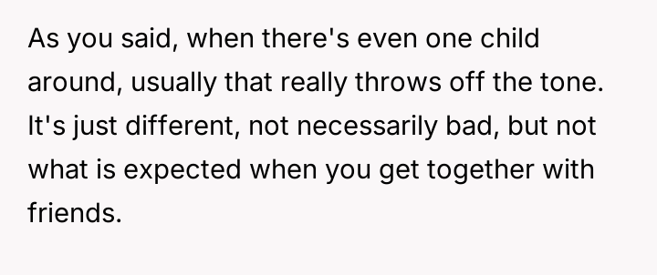 The childfree friend’s patience wears thin as she retreats into smaller, more manageable moments with individual friends, seeking solace in the fragments of friendship that still honor her choice and presence.