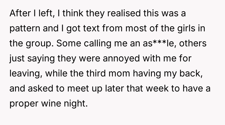 The OP's decision to leave the recent event highlighted their strong need for child-free time, which directly clashes with the expectations or habits of some of the mothers in the group.