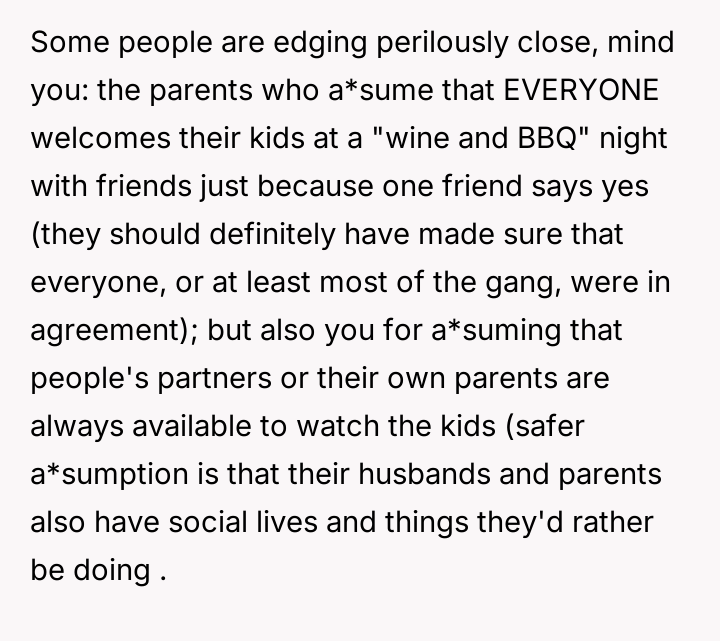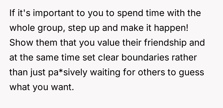 The childfree friend’s patience wears thin as she retreats into smaller, more manageable moments with individual friends, seeking solace in the fragments of friendship that still honor her choice and presence.