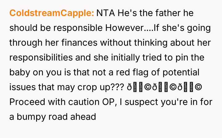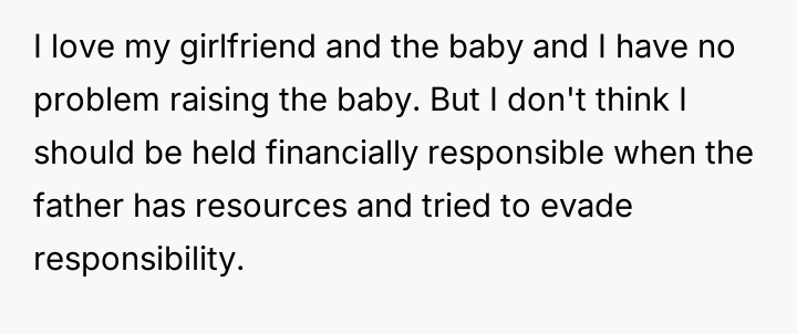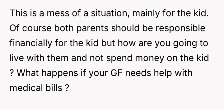 The original poster (OP) is caught between loving his girlfriend and the child, and his firm boundary regarding financial responsibility, which was initially agreed upon but has now caused significant stress for his partner.