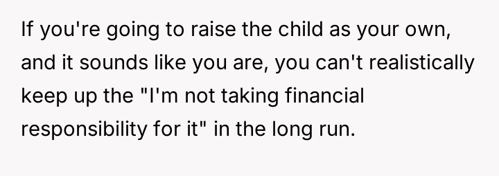 Is the OP justified in strictly adhering to the initial agreement, prioritizing his financial autonomy while supporting the child through labor, or should love and commitment to the partner supersede this boundary, requiring him to assume full financial responsibility for the child despite the existence of a biological father?