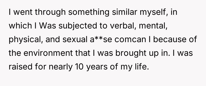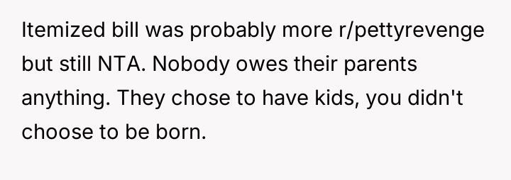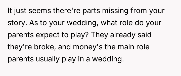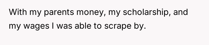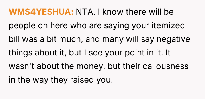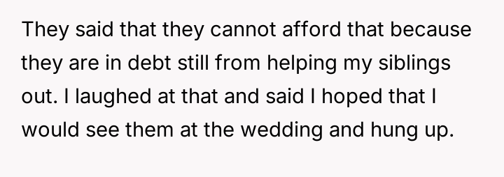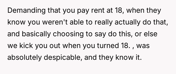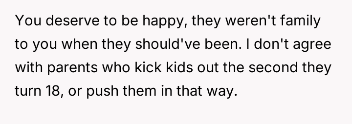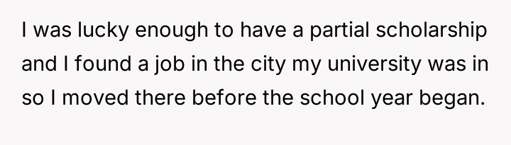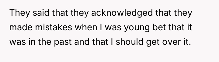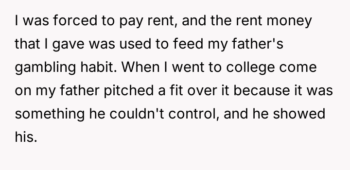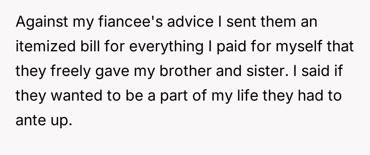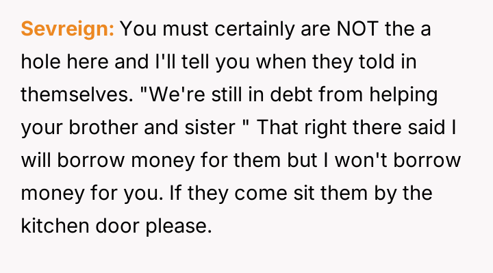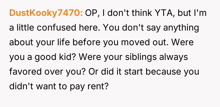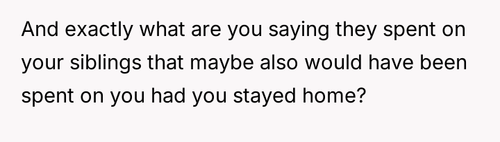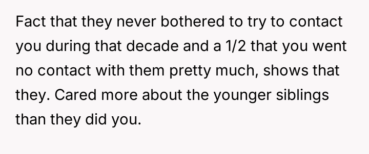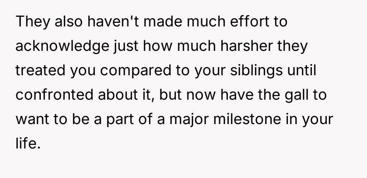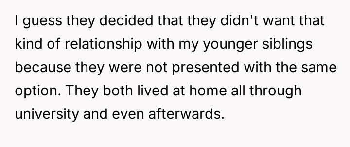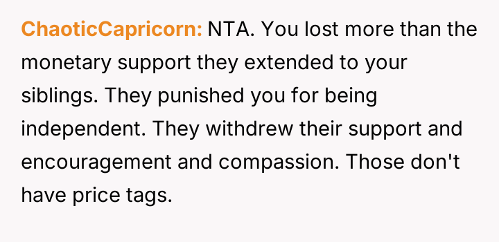 The original poster (OP) is confronting a long-standing feeling of being unsupported by their parents, directly contrasting their forced early independence with the continued support given to their siblings.