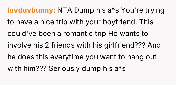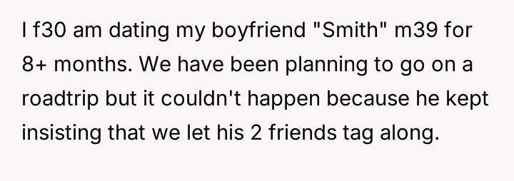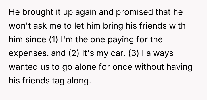 The original poster experienced a significant breakdown in trust and autonomy when her boyfriend brought friends on a trip they had agreed would be for the couple only, despite her paying for the trip and using her vehicle.