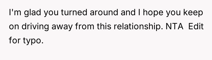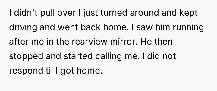 Was turning around and driving home an appropriate defense of personal boundaries against a clear breach of trust, or did this action escalate an avoidable conflict into an immediate relationship crisis?