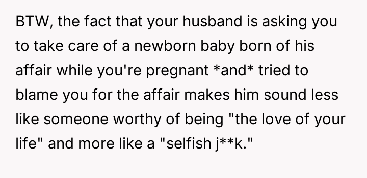 The original poster is experiencing profound emotional distress due to the sudden revelation of her husband's affair and the existence of a new baby, compounded by the demands of an impending birth and accusations from his family.