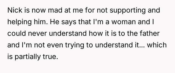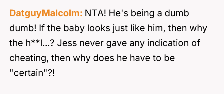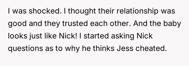 Given the existing trust, the appearance of the child resembling Nick, and Jess's recent physical and emotional trauma, is Nick's insistence on a paternity test a necessary step for relationship security, or is it an act of profound betrayal that prioritizes abstract doubt over his wife’s immediate emotional well-being?