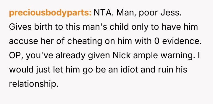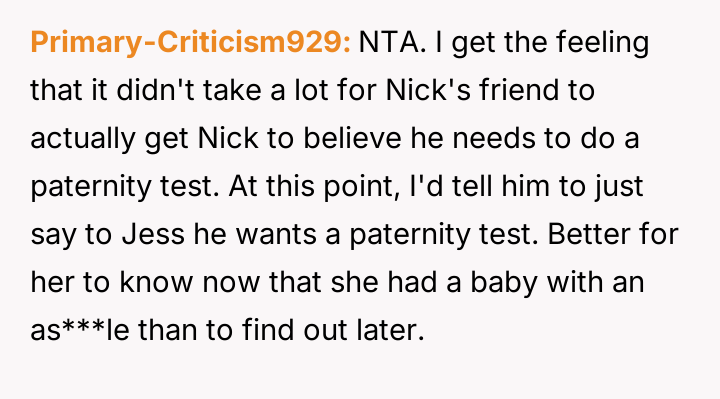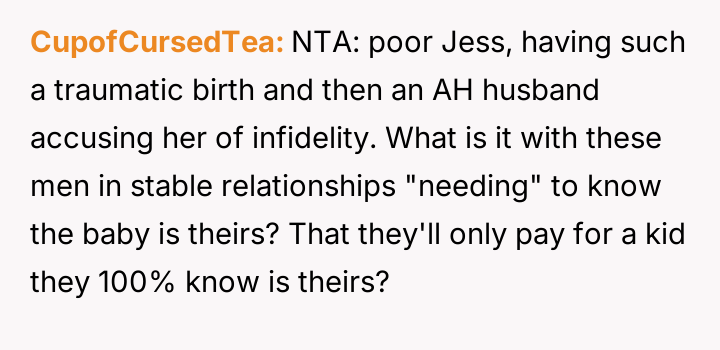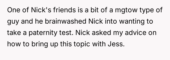 The original poster (OP) is deeply concerned about their friend Nick's decision to demand a paternity test from his wife, Jess, immediately following a traumatic childbirth.