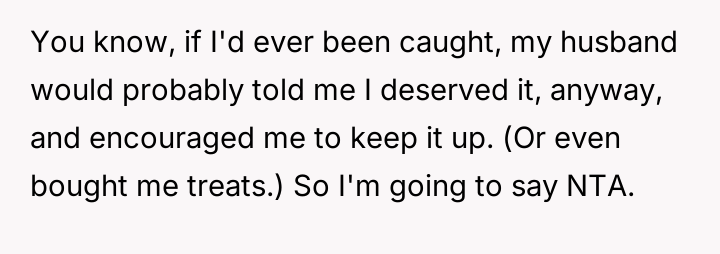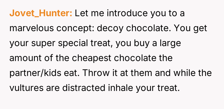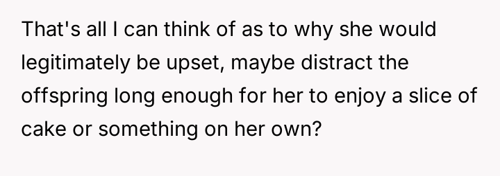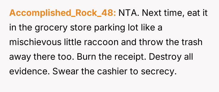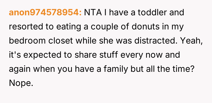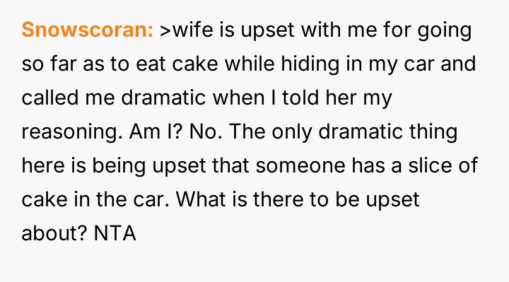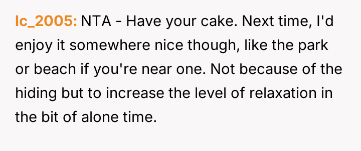 Was the act of eating cake alone in the car a necessary step to establish personal boundaries for mental well-being, or did this secretive action constitute an overly dramatic response to typical, albeit intrusive, family sharing habits?