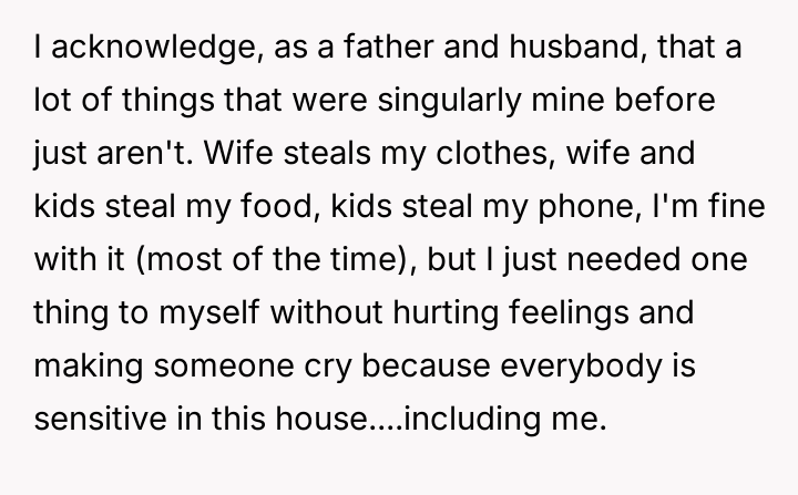 The original poster felt a strong need to secure a small, personal moment of enjoyment without interference from family members who frequently took their possessions.