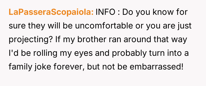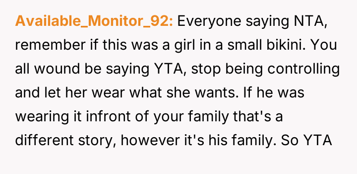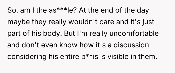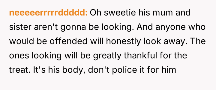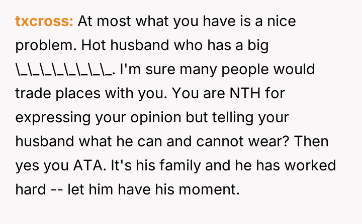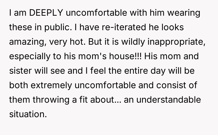 Given the OP's genuine discomfort regarding public exposure in a specific family environment versus the husband's right to choose his attire, the central question remains: When personal comfort clashes with a partner's desire for self-expression through clothing, especially when that expression involves public display that causes distress to the other partner in a specific social context, whose boundary should take precedence?