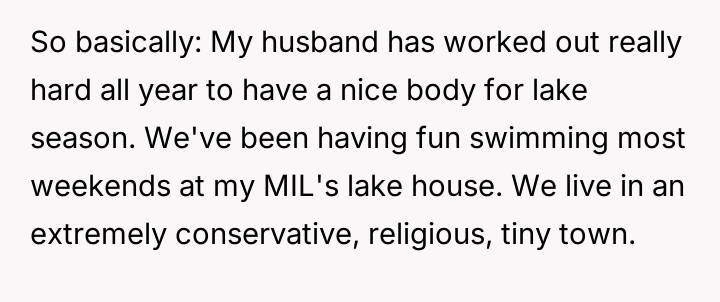 The original poster (OP) is experiencing significant distress because her husband insists on wearing revealing swim trunks that make his anatomy highly visible in public settings, particularly at his mother's home.