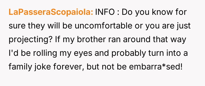 Given the OP's genuine discomfort regarding public exposure in a specific family environment versus the husband's right to choose his attire, the central question remains: When personal comfort clashes with a partner's desire for self-expression through clothing, especially when that expression involves public display that causes distress to the other partner in a specific social context, whose boundary should take precedence?