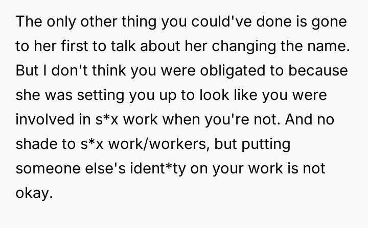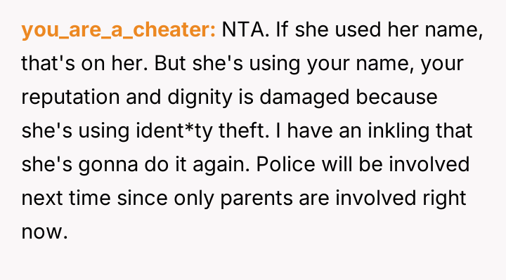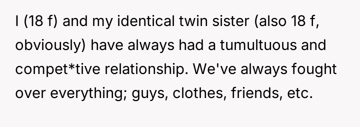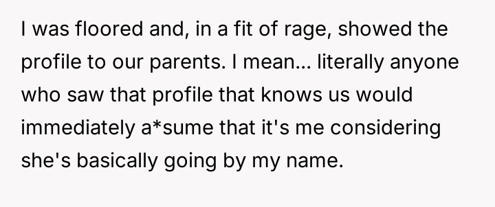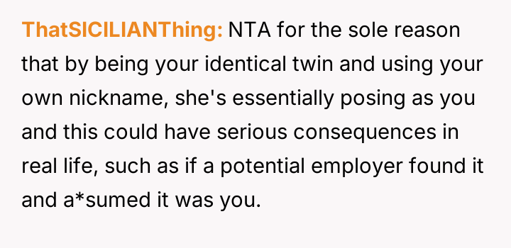 The original poster (OP) faced a severe breach of trust when her twin sister created an explicit online profile using the OP's specific nickname, leading to confusion and potential reputational harm.