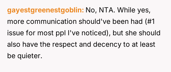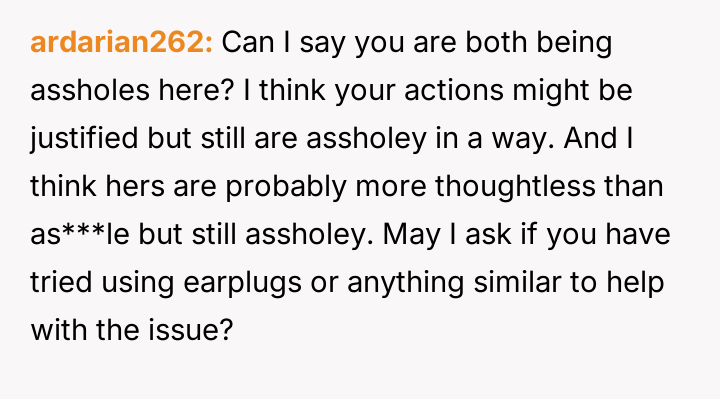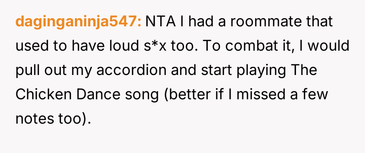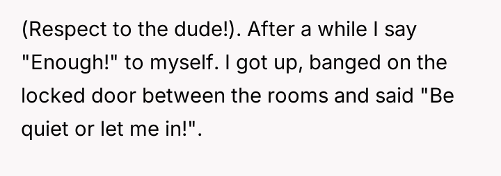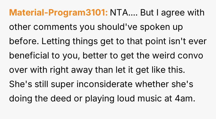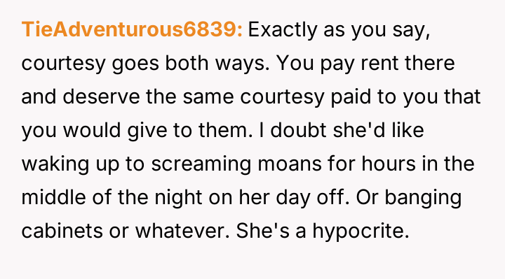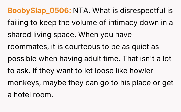 Considering that both parties contribute to the rent, does the right to sexual activity override the shared right to a peaceful living environment that ensures necessary rest, or was the poster's aggressive method of enforcement disproportionate to the shared living agreement?