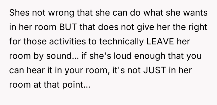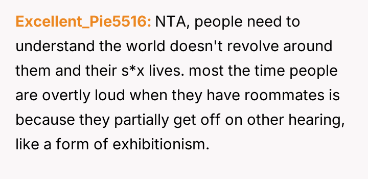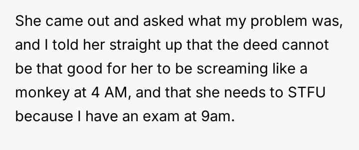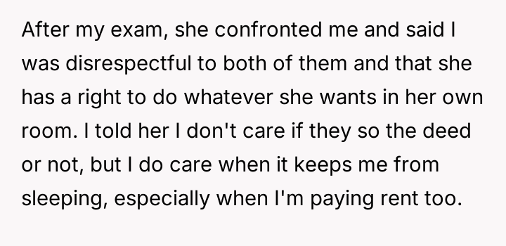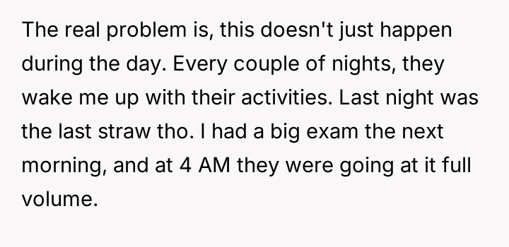 The original poster is facing a significant conflict between maintaining their need for sleep, especially before an important exam, and their roommate's perceived right to sexual privacy and expression within her own space.