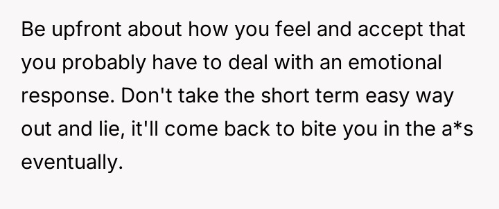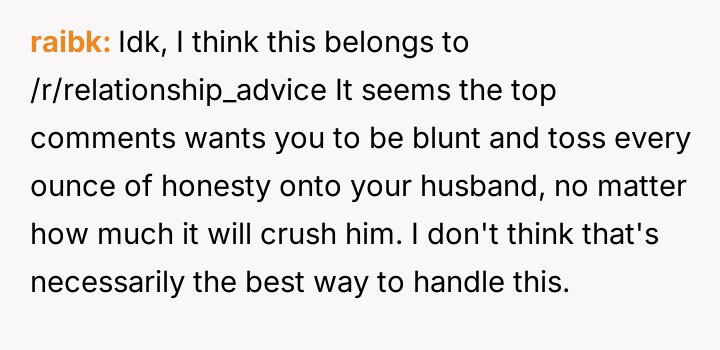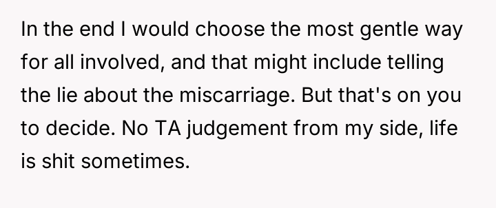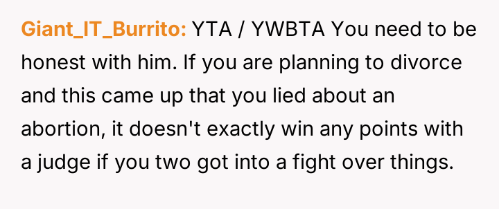 The core debate centers on whether lying to her husband about a miscarriage to facilitate a planned abortion and subsequent divorce is justifiable to protect his immediate feelings, or if this deception constitutes a greater betrayal of their long-standing commitment, making immediate truth the only ethical path forward.