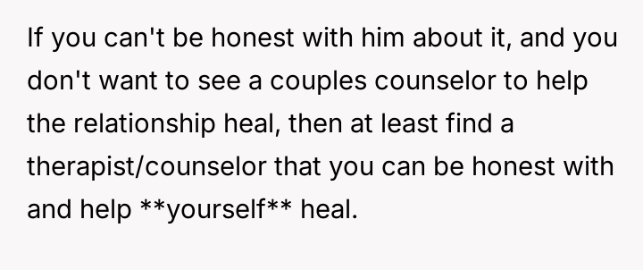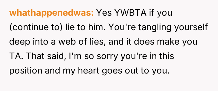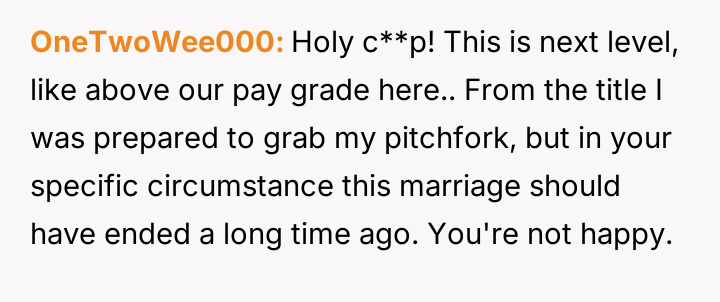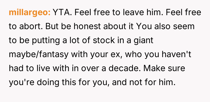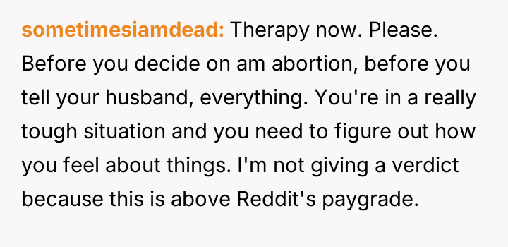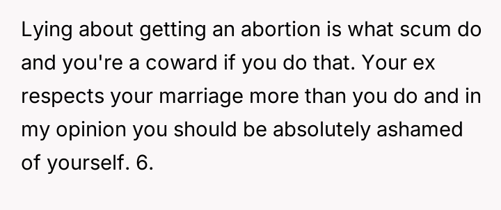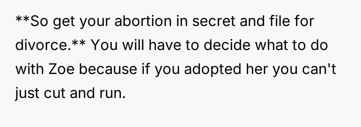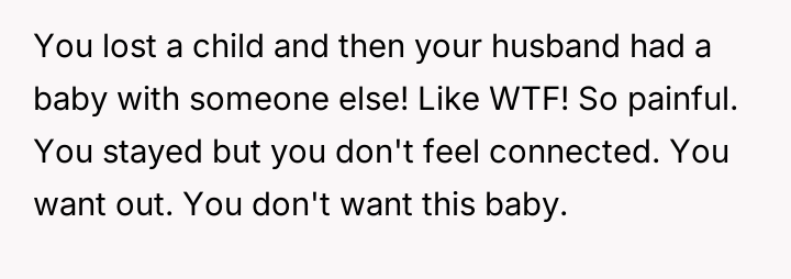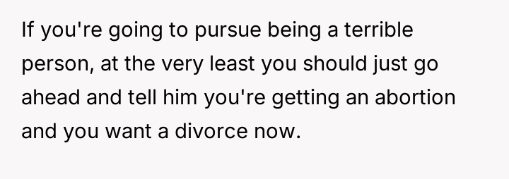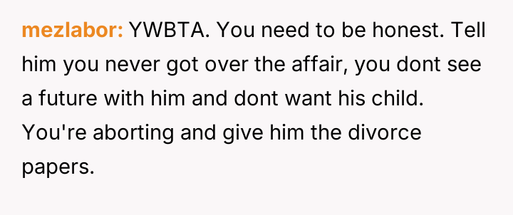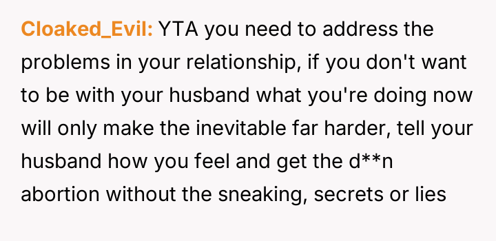 The original poster is facing a profound personal conflict, torn between maintaining a painful marriage under false pretenses and seeking personal truth through separation and abortion.