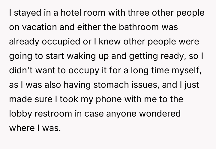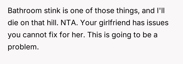The original poster experienced a strong conflict between his practical concern for hygiene and consideration (avoiding bathroom odor) and his girlfriend's intense need for presence and reassurance during their shared time away.