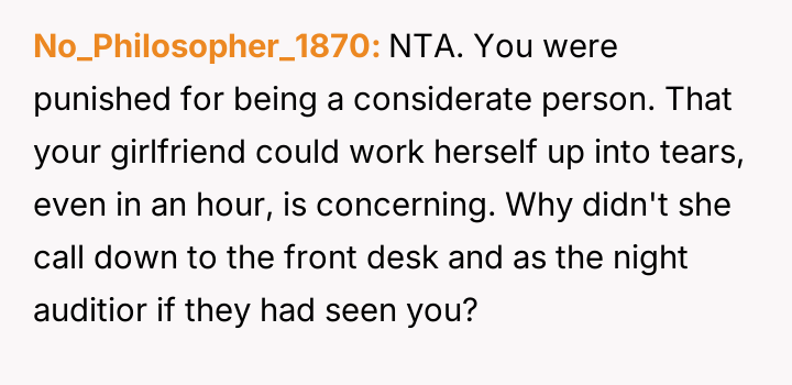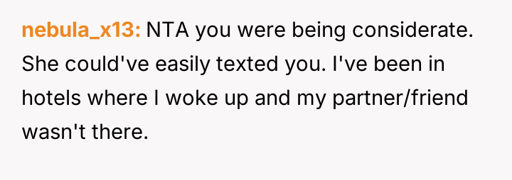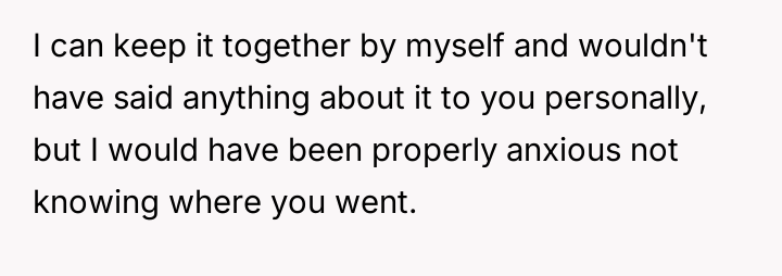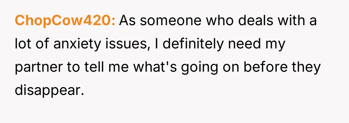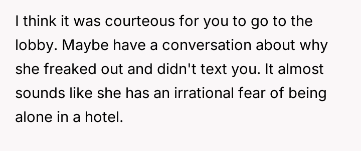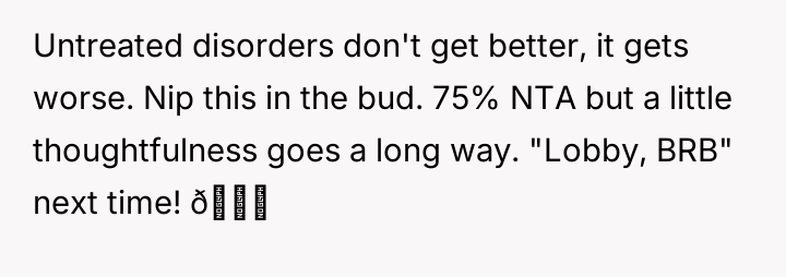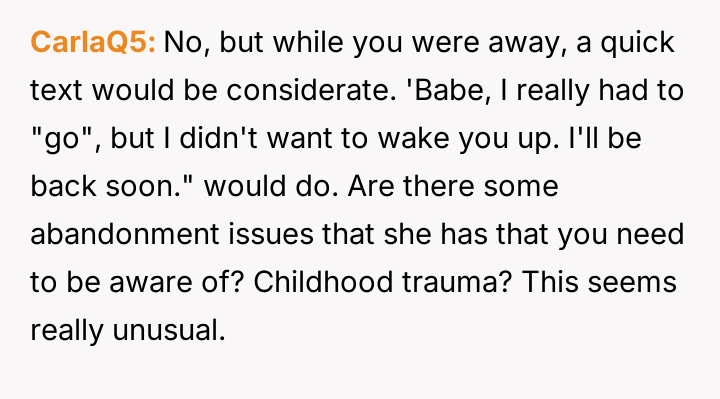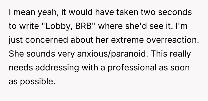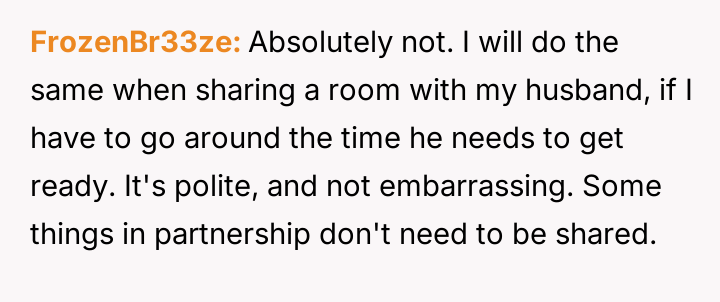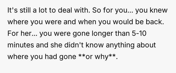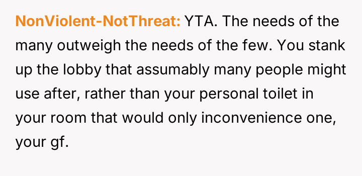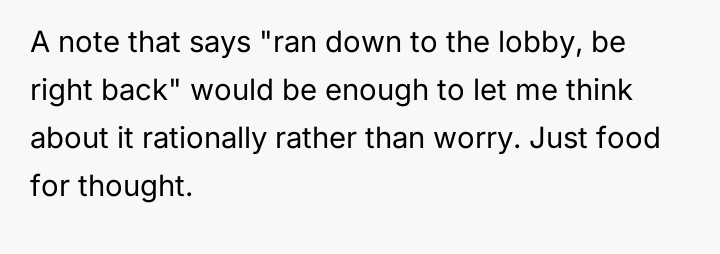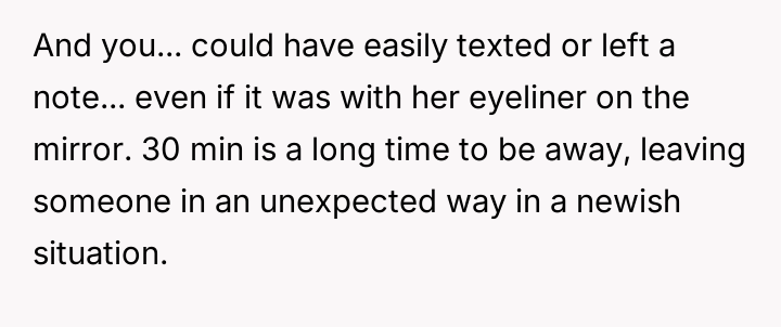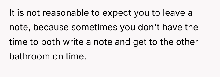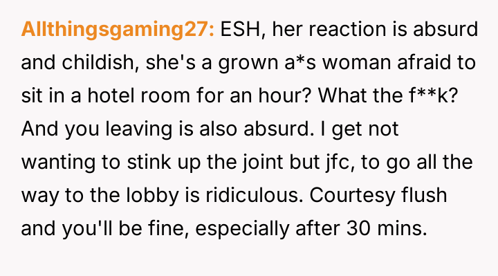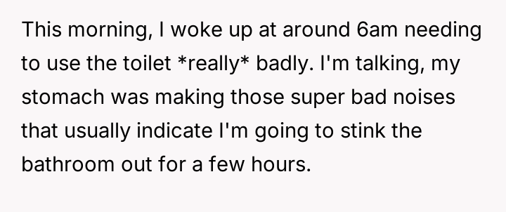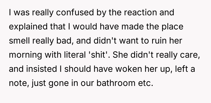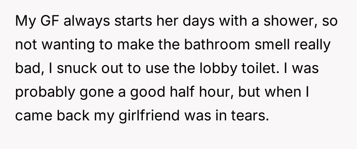 Was the poster's decision to prioritize avoiding temporary bathroom odor over immediate transparency and physical presence with his partner a reasonable act of consideration, or did this lack of communication violate a necessary boundary of trust and security within the relationship context?