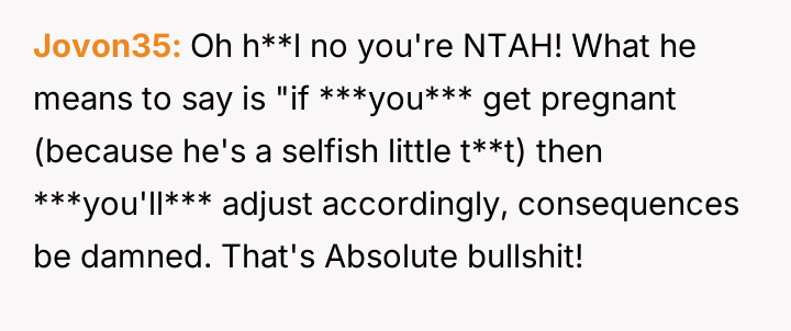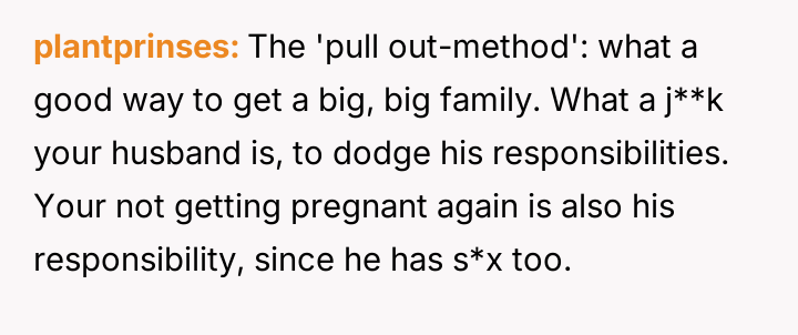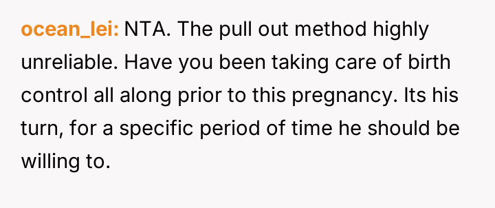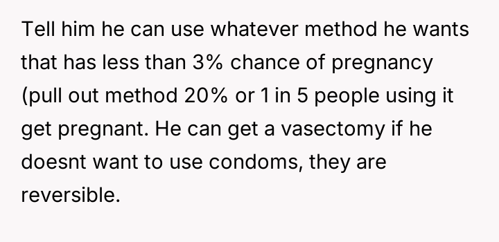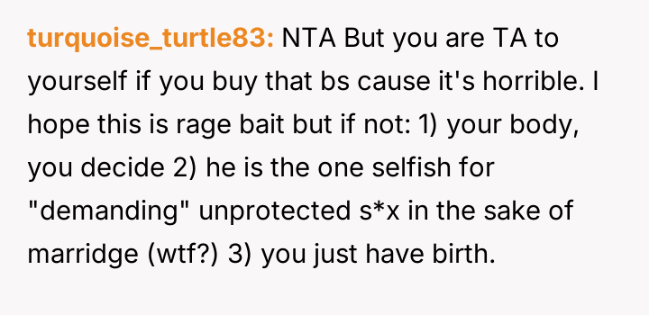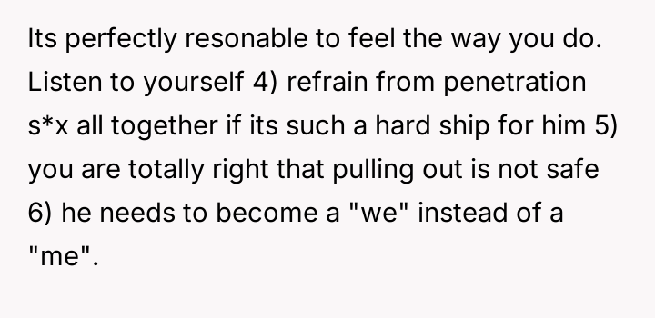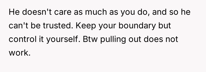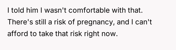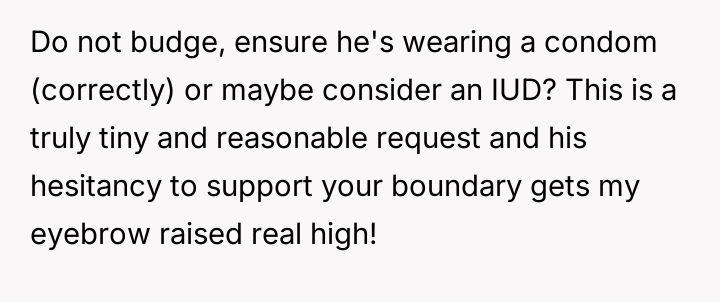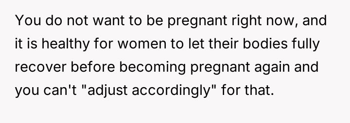 Given the OP's absolute need to prevent another rapid pregnancy due to health and financial reasons, is it reasonable for the husband to pressure her to abandon a stated contraceptive boundary, or does marital intimacy require that both partners must agree to the method used for protection?