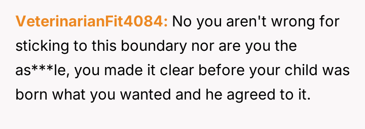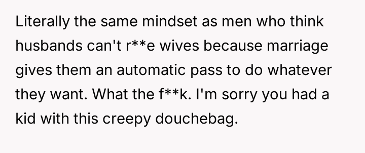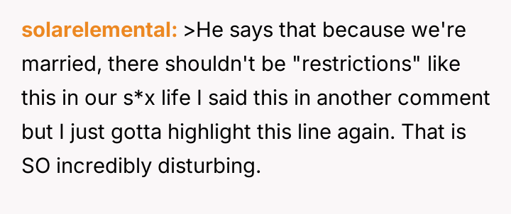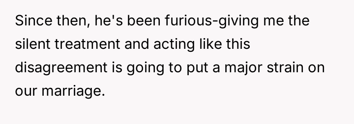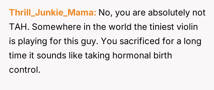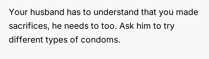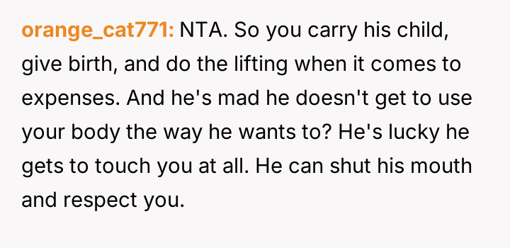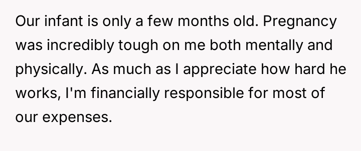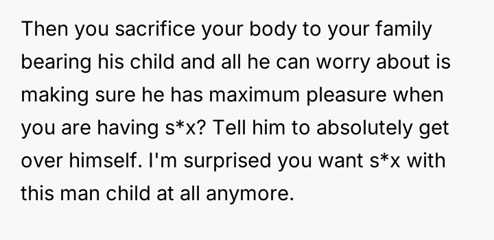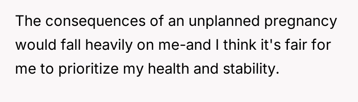 She feels justified in prioritizing her well-being and the family's financial stability following a difficult pregnancy, while her husband interprets her boundary as selfish restriction within their marital intimacy.