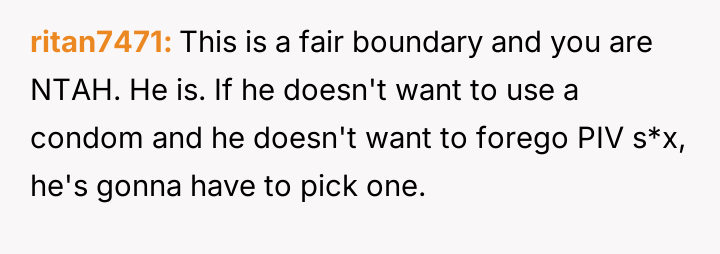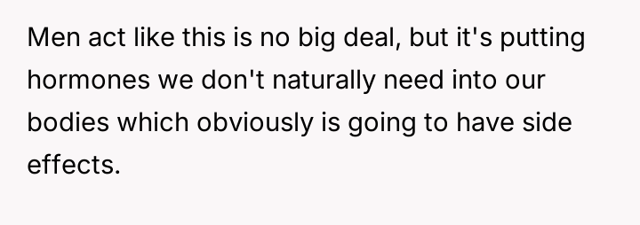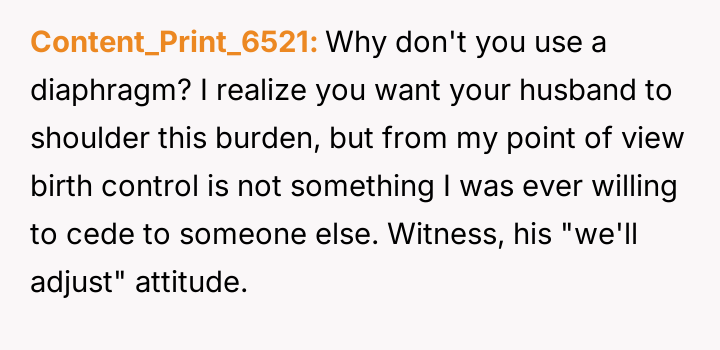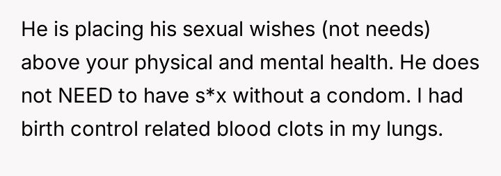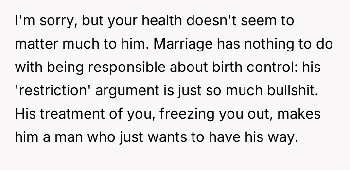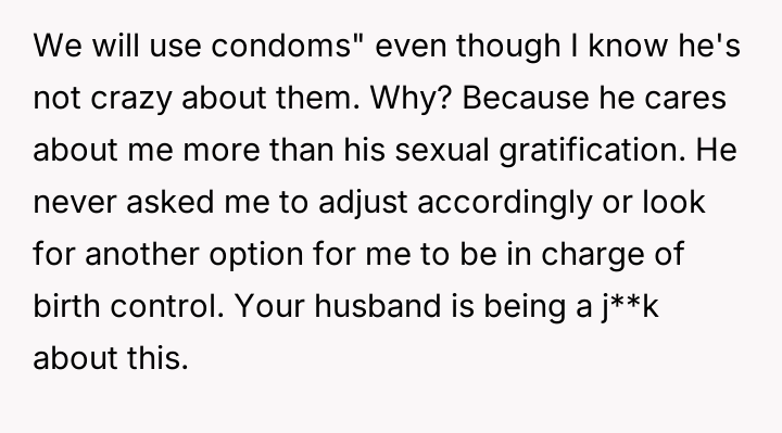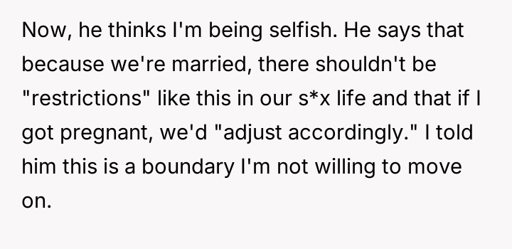 The original poster (OP) is facing a significant conflict where her necessary health and stability boundary regarding contraception clashes directly with her husband's desire for a specific sexual practice.