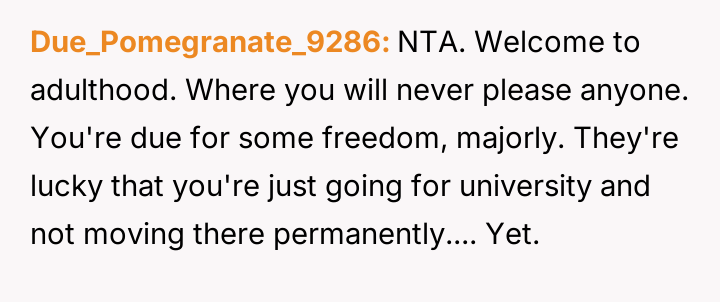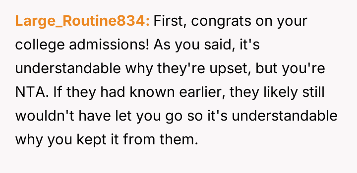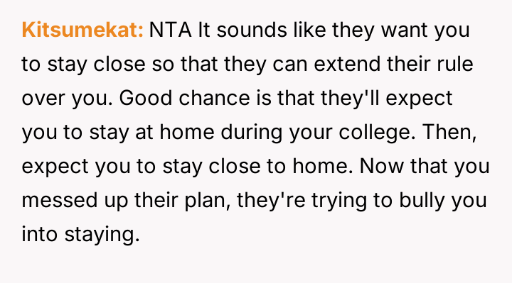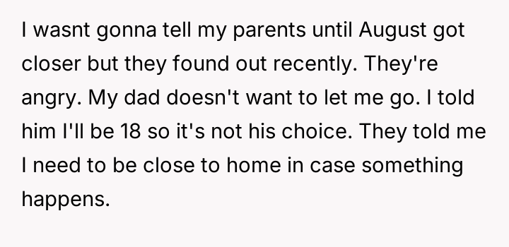Given the OP's commitment to moving out of state for college and his parents' strong opposition based on fear and control, is the parents' insistence on dictating his post-high school living arrangements justified by their responsibility as caregivers, or does the OP have an absolute right to self-determination upon turning eighteen?