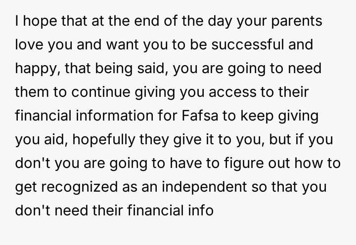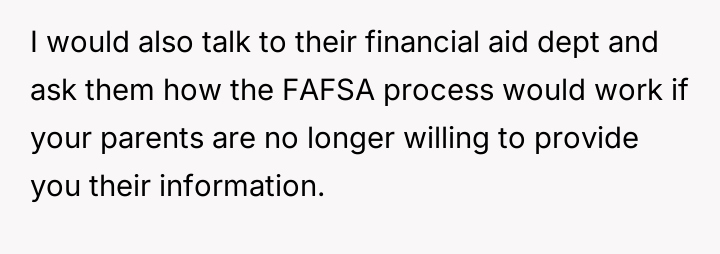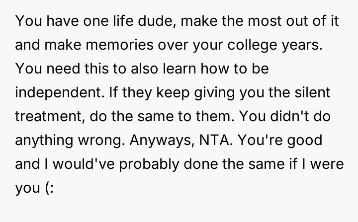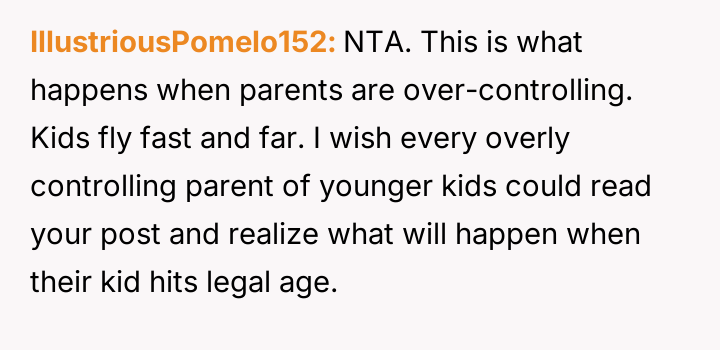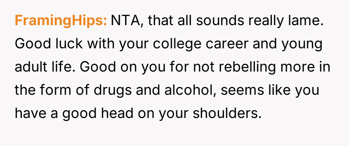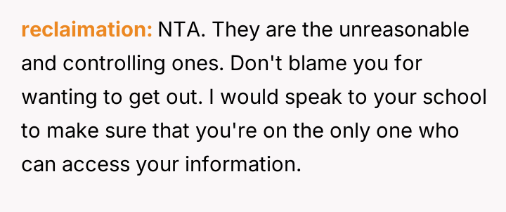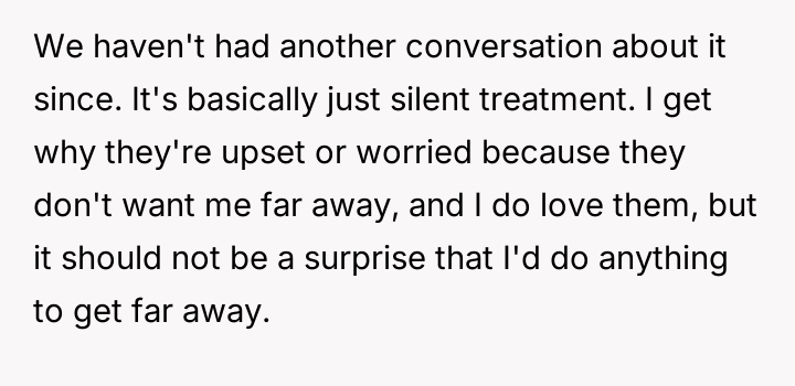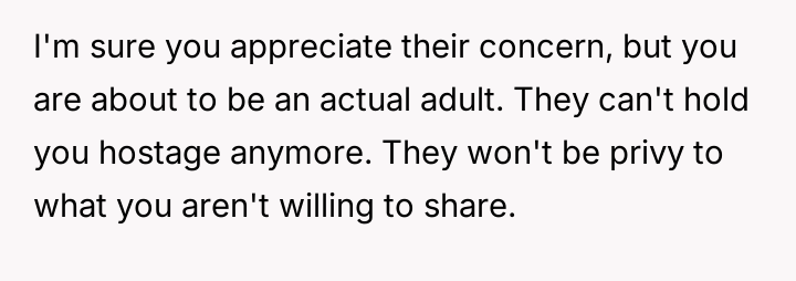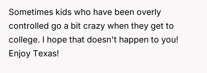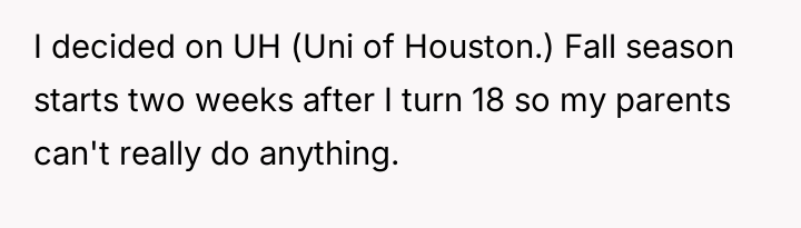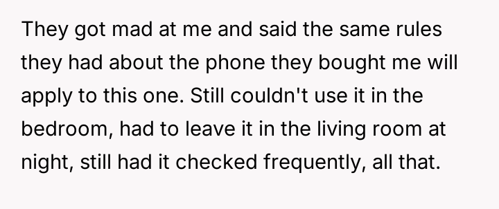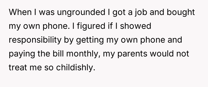 Despite his efforts to demonstrate responsibility, such as earning and paying for his own phone, his parents maintained control, leading him to secretly plan for college far away to secure autonomy.