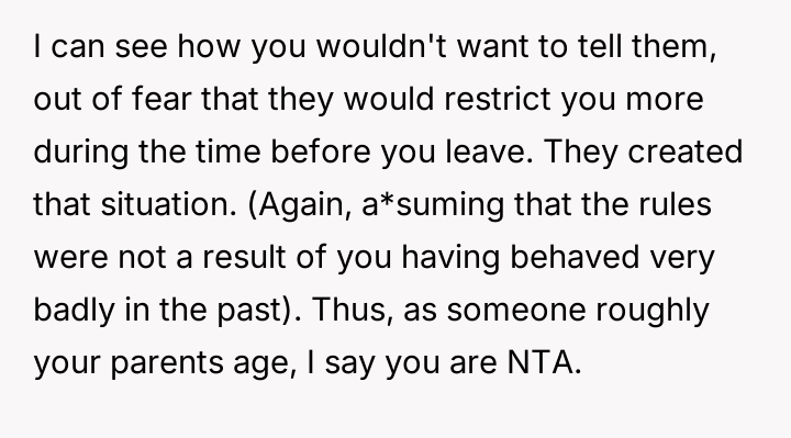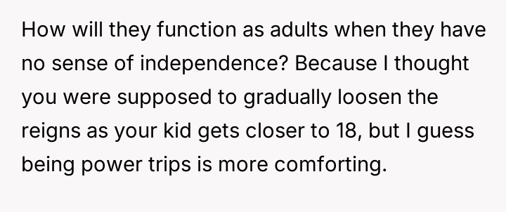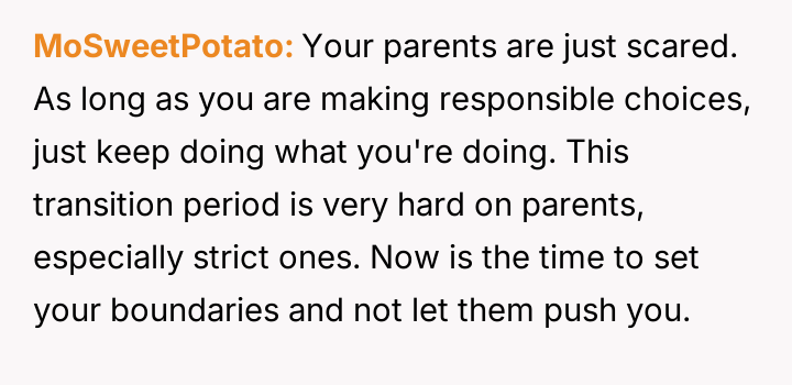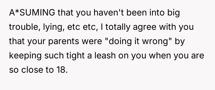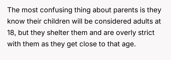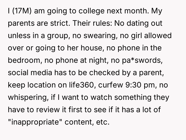 The original poster (OP) feels trapped by his strict parents, whose excessive rules conflict directly with his growing need for independence as he approaches adulthood.