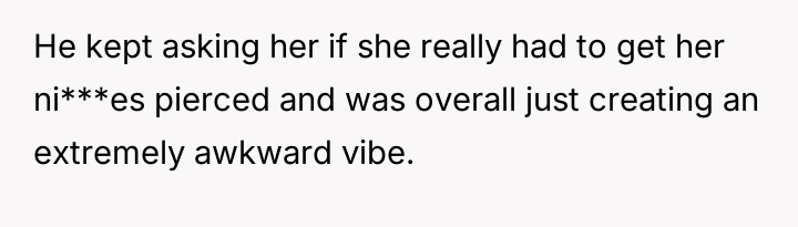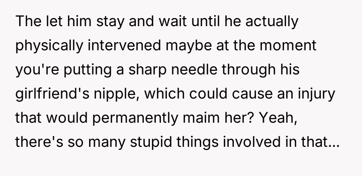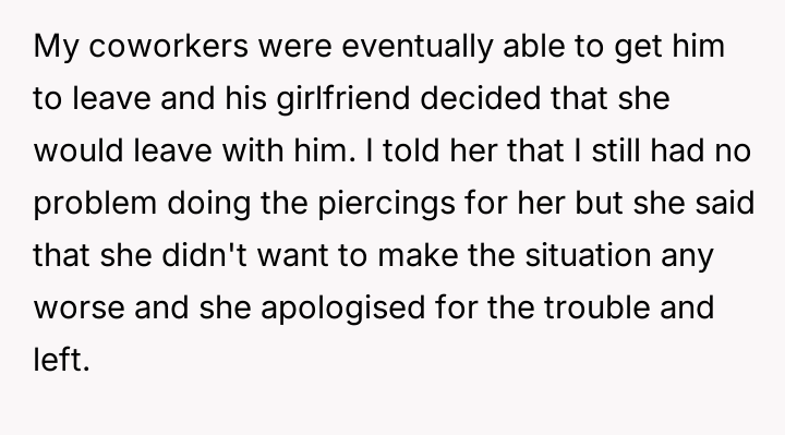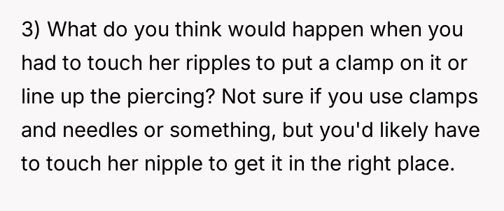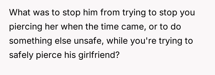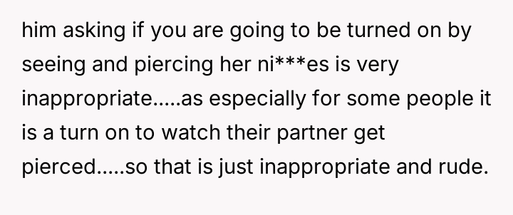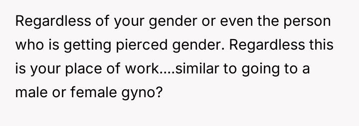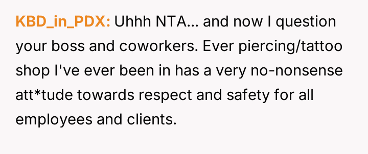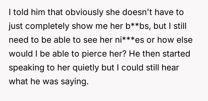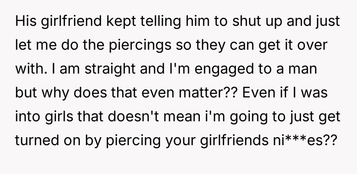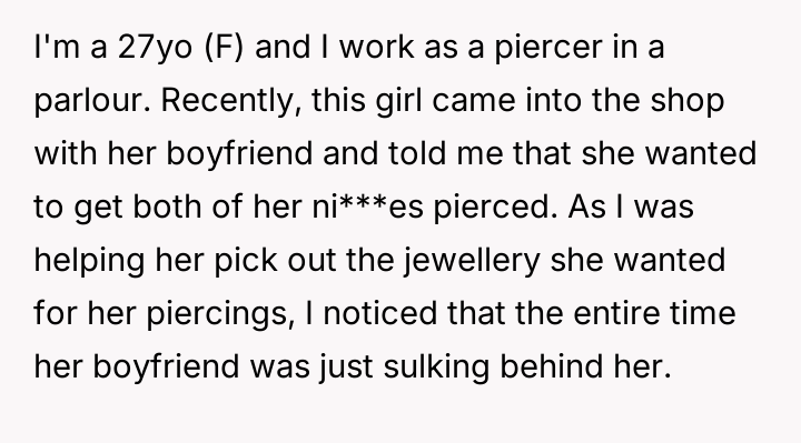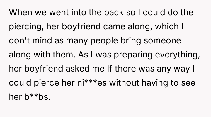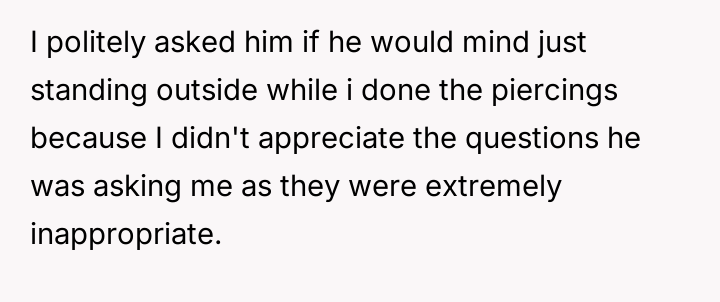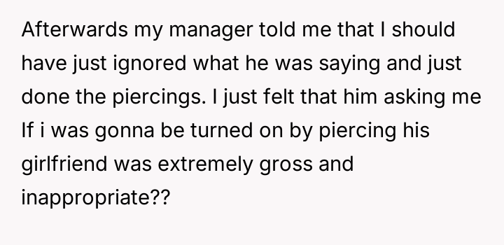 Was the piercer justified in prioritizing her professional comfort and setting a firm boundary against sexually inappropriate comments from a client's partner, or should she have adhered to the manager's advice to ignore the behavior to ensure the service was completed?
