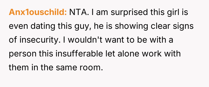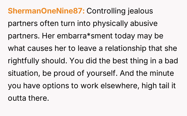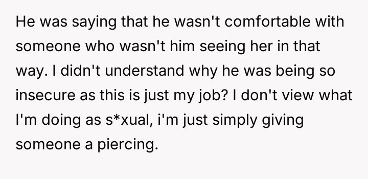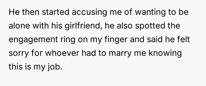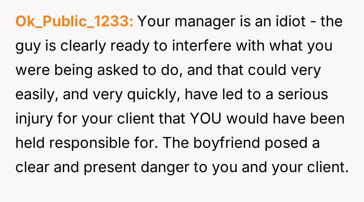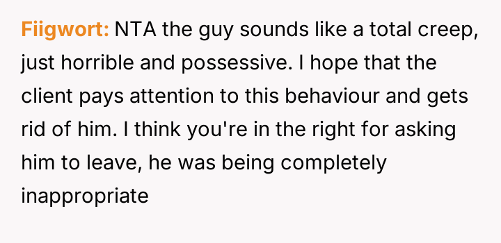 The original poster (OP) found herself in a deeply uncomfortable situation where her professional duties were aggressively questioned due to the extreme insecurity of a client's boyfriend.
