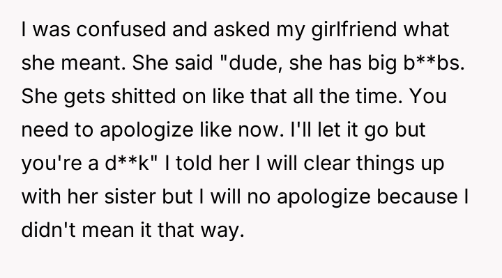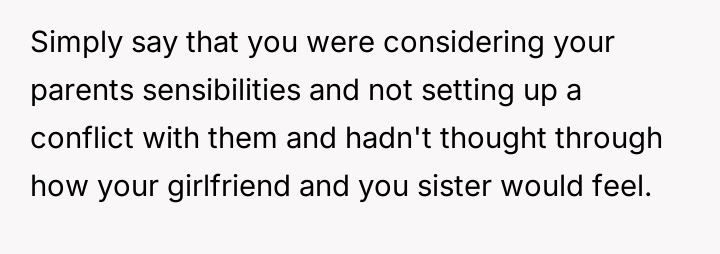 This action resulted in significant offense to the yoga instructor sister, who felt disrespected, and created a major conflict with his long-term girlfriend, who interpreted his request as controlling behavior.