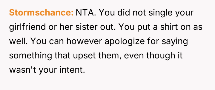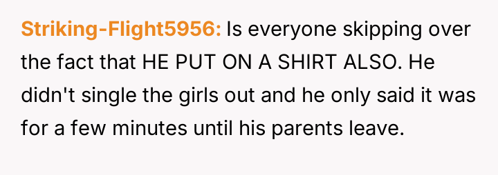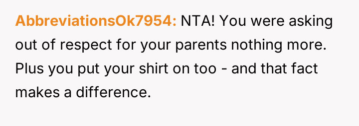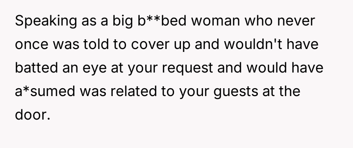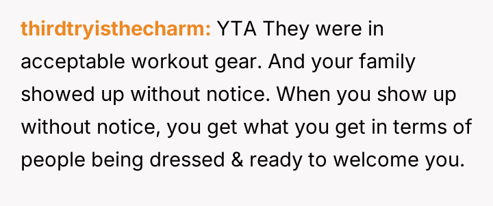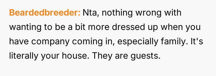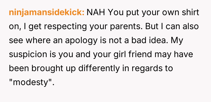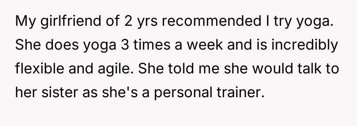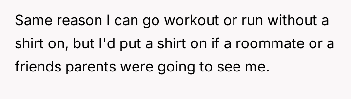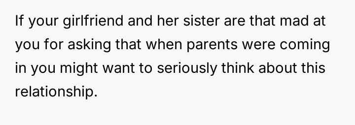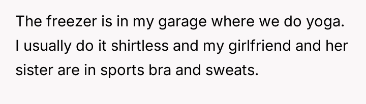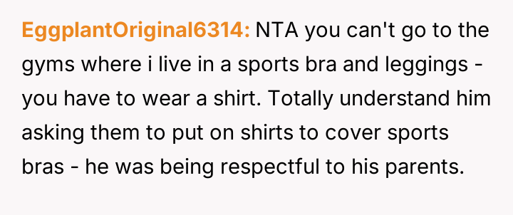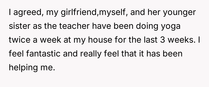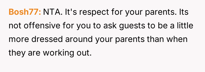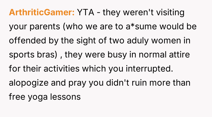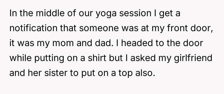The original poster (OP) is caught between his desire to maintain a comfortable and private environment for his yoga sessions and the unexpected arrival of his parents, leading him to request his girlfriend and her sister cover up.