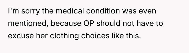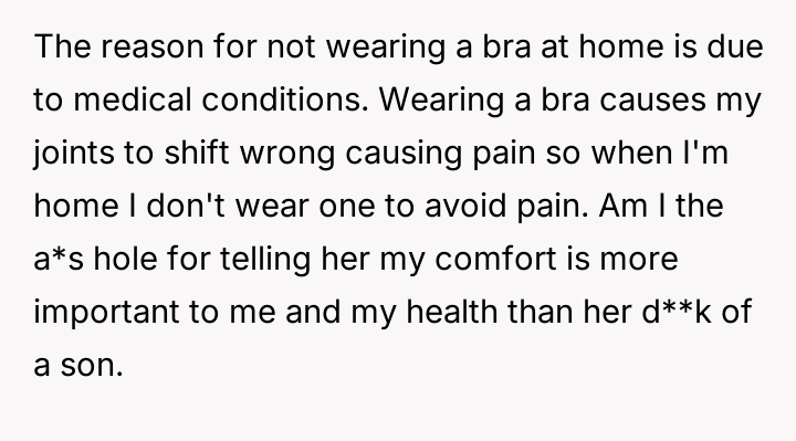 The central conflict lies in the clash between the OP's medically necessary comfort within her own home and the mother-in-law's projection of her son's discomfort onto the OP's personal choices.