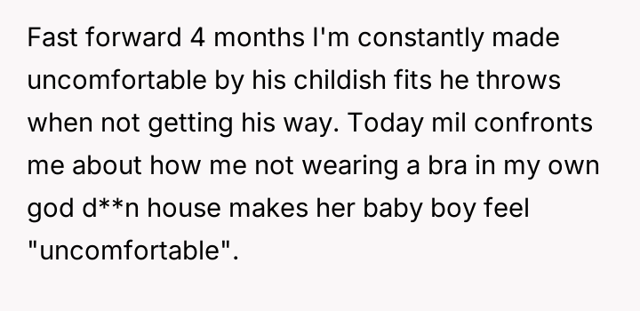 The Original Poster (OP) is facing significant strain due to the unexpected addition of a brother-in-law to their household, feeling her personal boundaries and health needs are being disregarded by both the brother-in-law's childish behavior and the mother-in-law's intrusive demands regarding her attire.